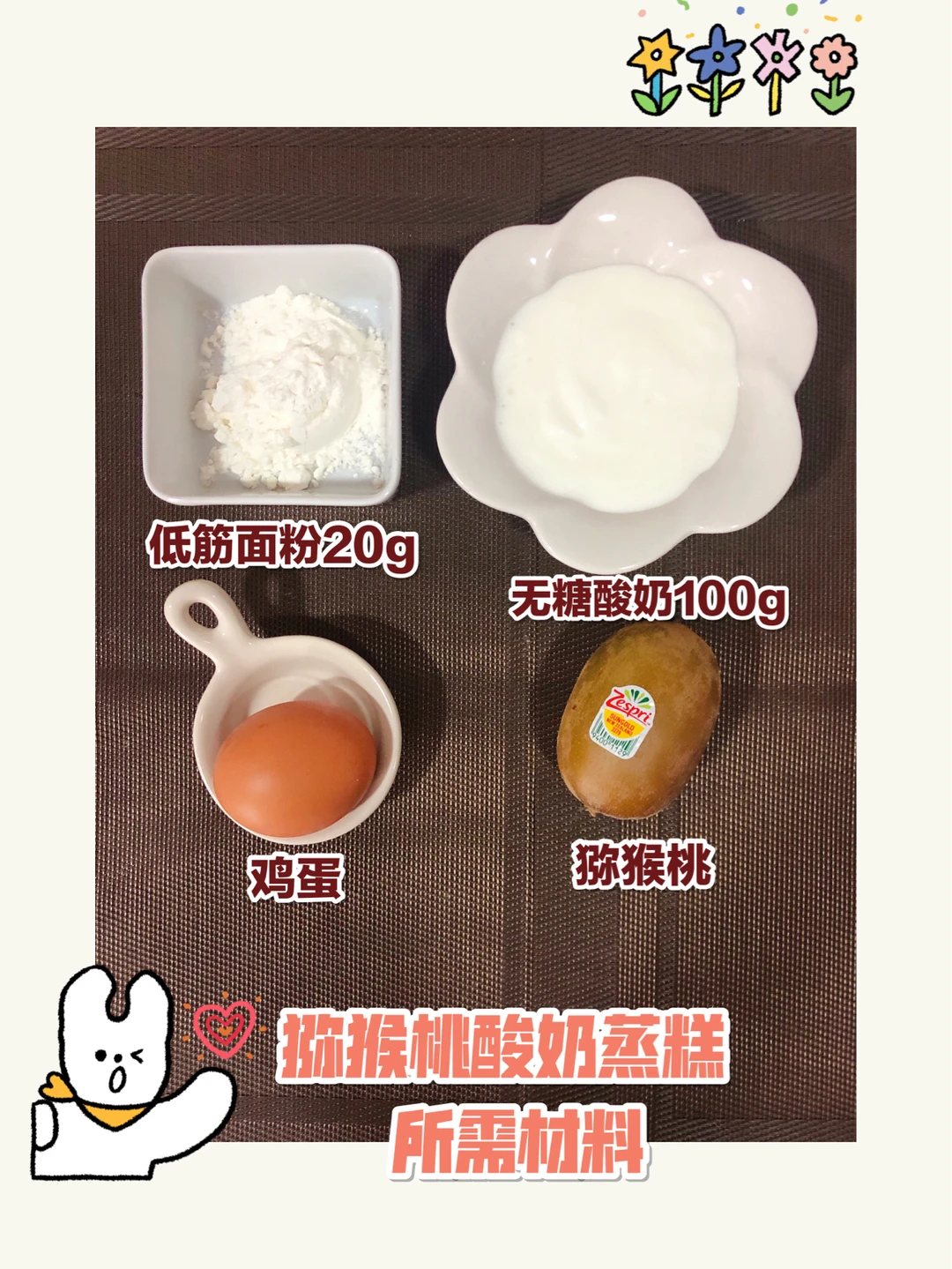 🌈准备材料:猕猴桃一个,鸡蛋一个,低筋面粉20克,无糖酸奶100克([大笑R]酸奶我自己做的)