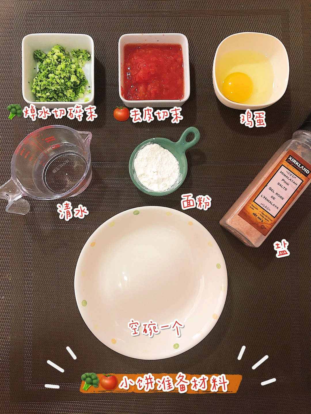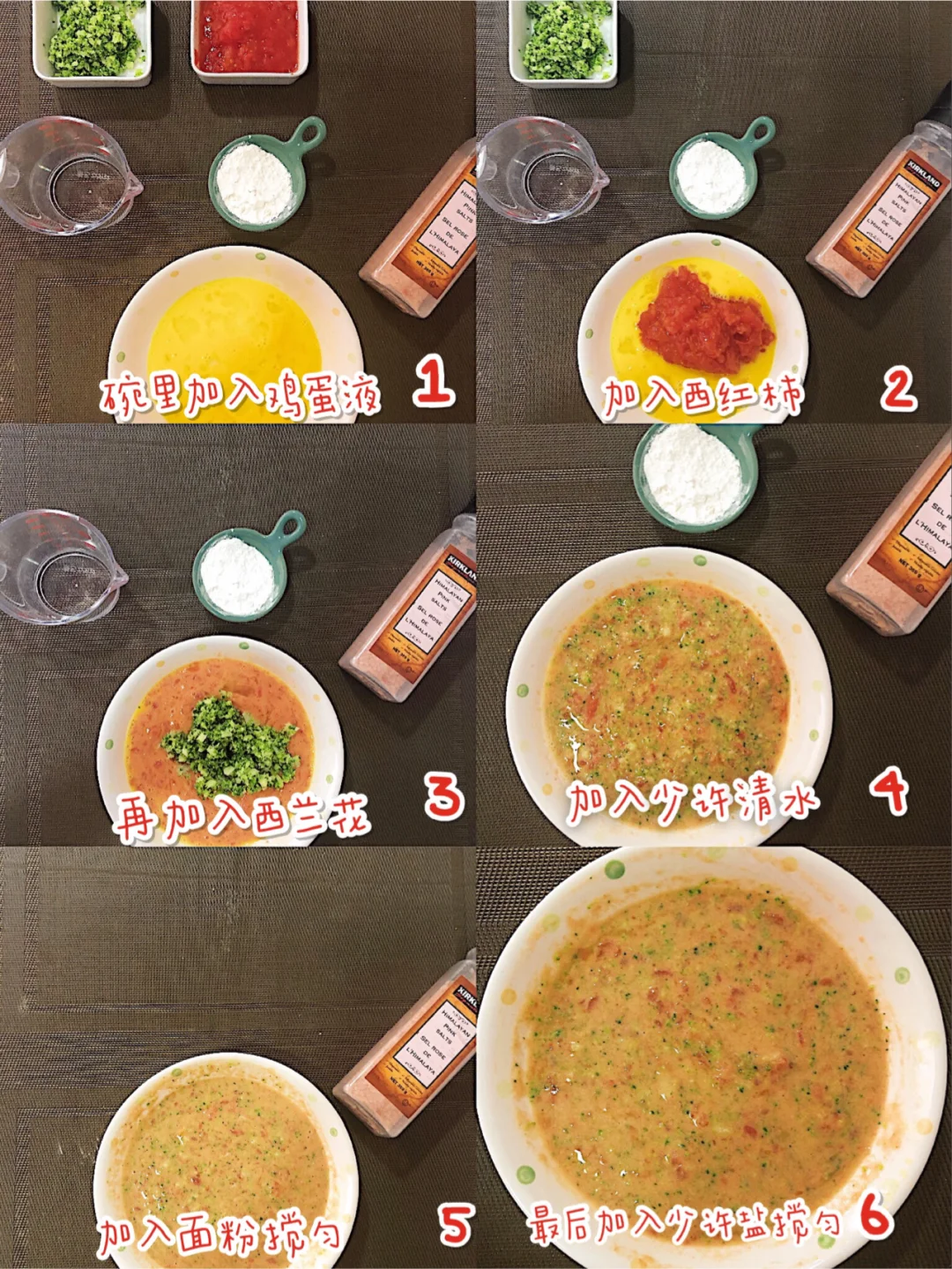 🎈鸡蛋液里依次加入西红柿、西兰花搅拌均匀,加入少量清水搅匀,再加入少许面粉和盐搅匀备用.(💡P.S.不喜欢口感太软的小饼,忽略加水这一步)