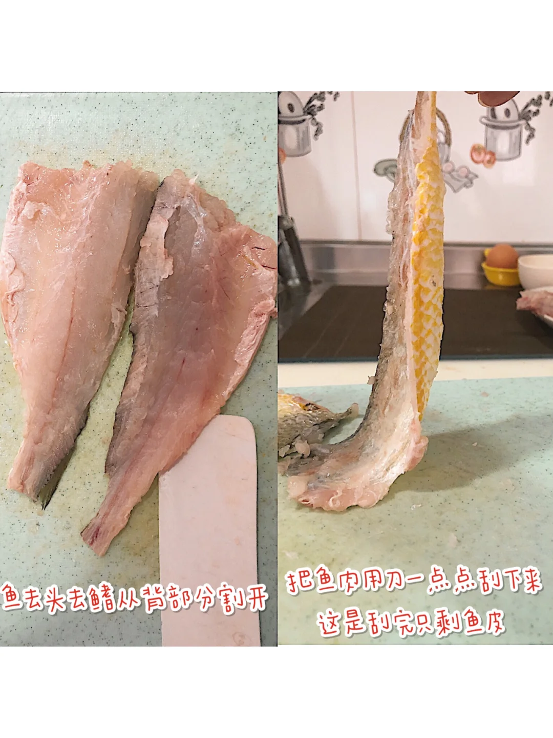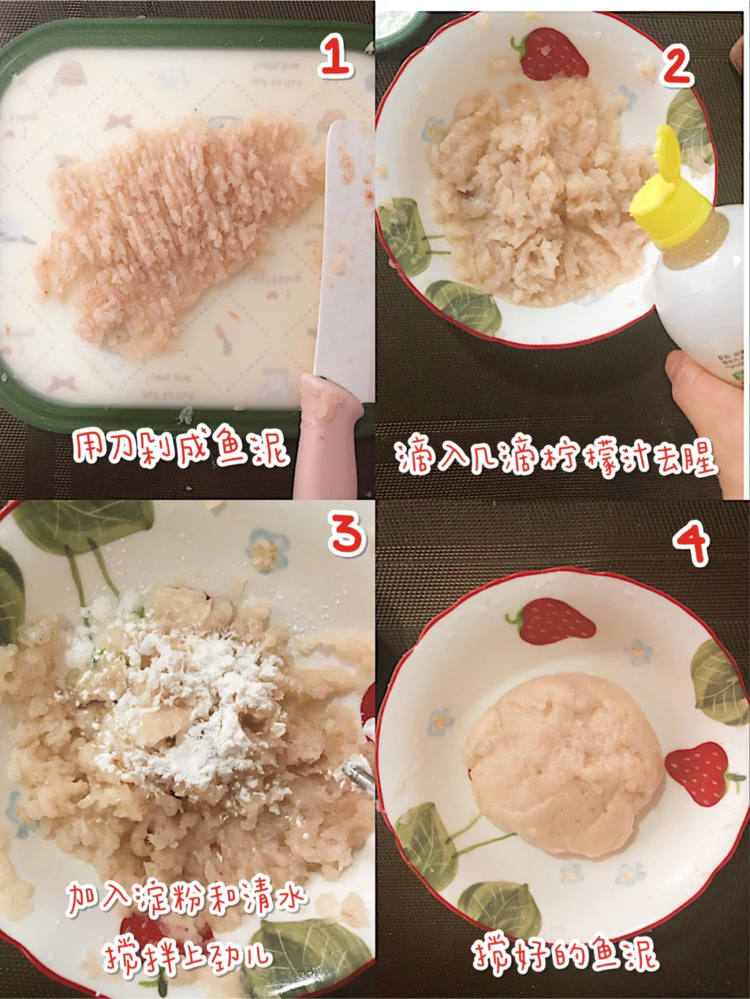 🎈黄花鱼洗净、去头、去鳍,用刀从背部分切开,去掉鱼刺,用刀把鱼肉刮下来,用刀背剁成鱼泥,滴入几滴柠檬汁去腥,加入清水和淀粉,往一个方向搅拌上劲儿,鱼泥就调好了.(💡P.S. 鱼泥一定用手多捏🤏几遍,以防🈶️遗漏的鱼刺)