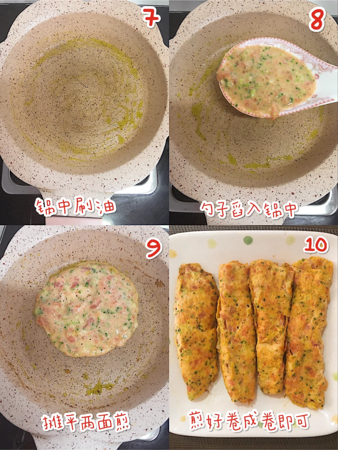 🎈锅中刷油,油热后用勺子舀入糊糊,用勺子底部把糊糊摊开,不要急着翻面,待周围微微起边,用铲子翻面,煎另一面,两面煎熟卷成卷即可.
