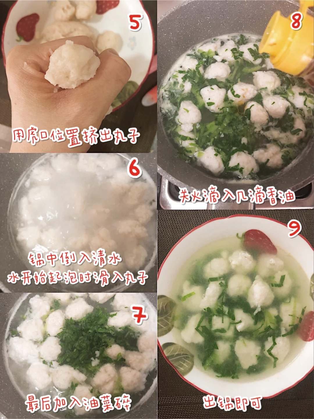 🎈锅中倒入清水,待水刚刚开始起泡,滑入用虎口挤出的丸子,煮开,鱼丸飘起,下入油菜碎,略煮一会,关火滴入几滴香油,出锅即可.