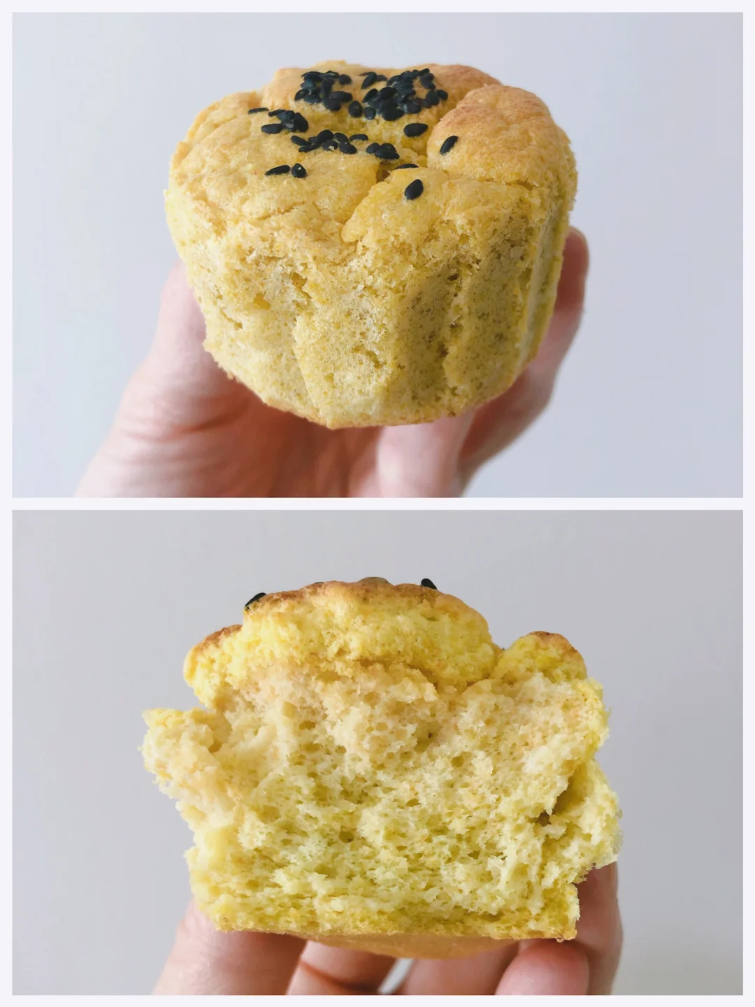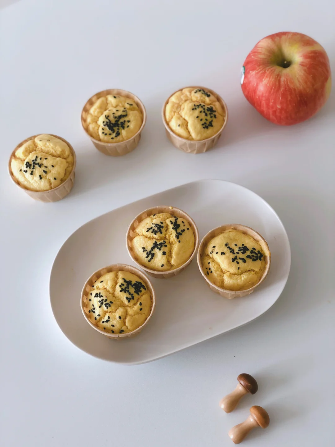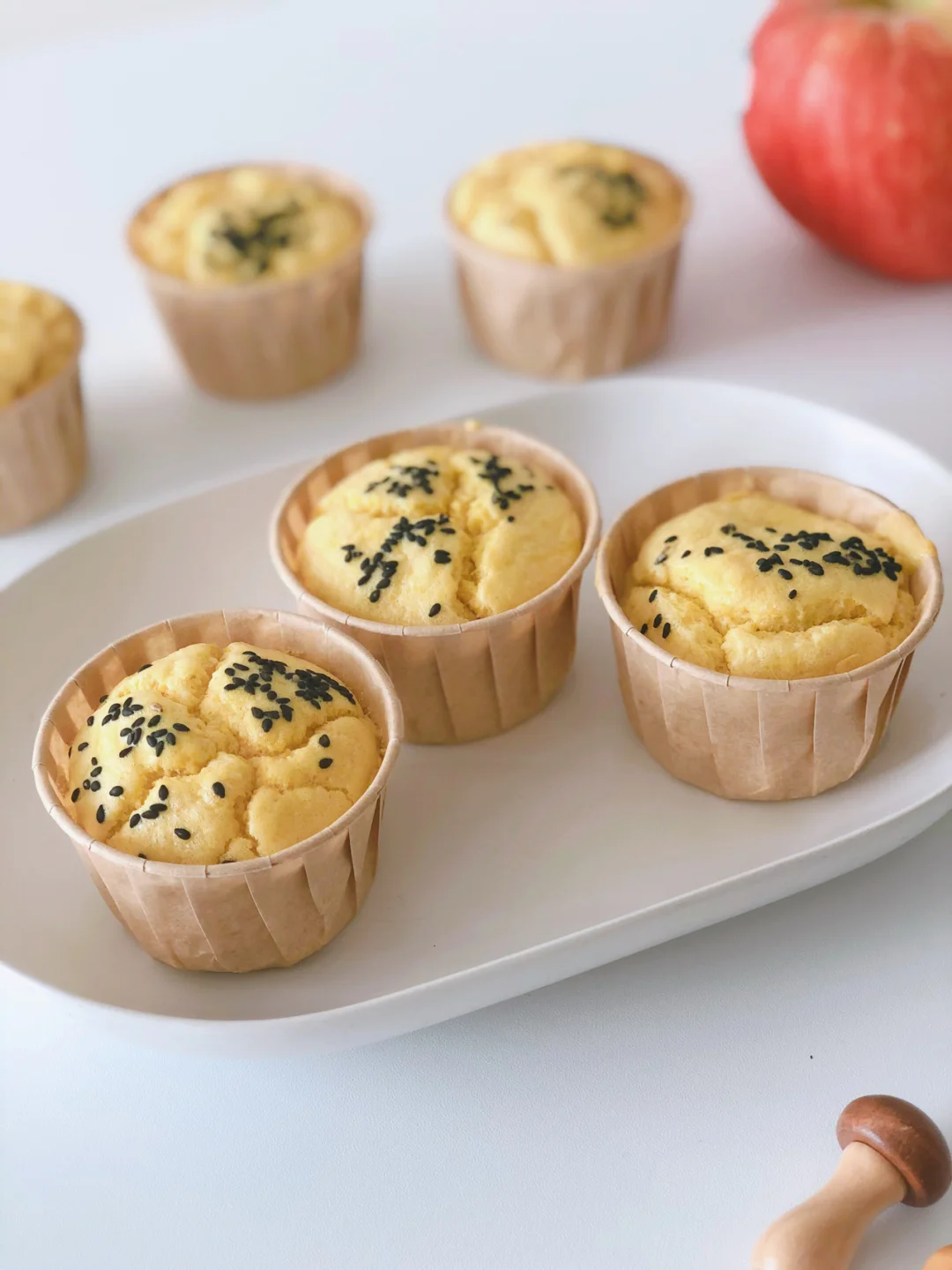 🎈倒入蛋糕纸杯中,震一下,撒上一些黑芝麻(一岁下不放芝麻),进烤箱120度40分钟即可。
