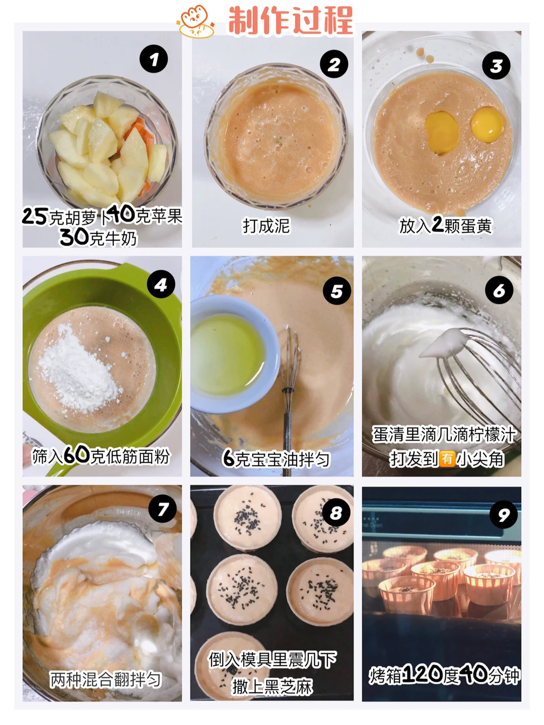 🎀准备材料:苹果40克,胡萝卜25克,牛奶30克(可用配方奶)低筋面粉60克 鸡蛋2颗,宝宝油6克.