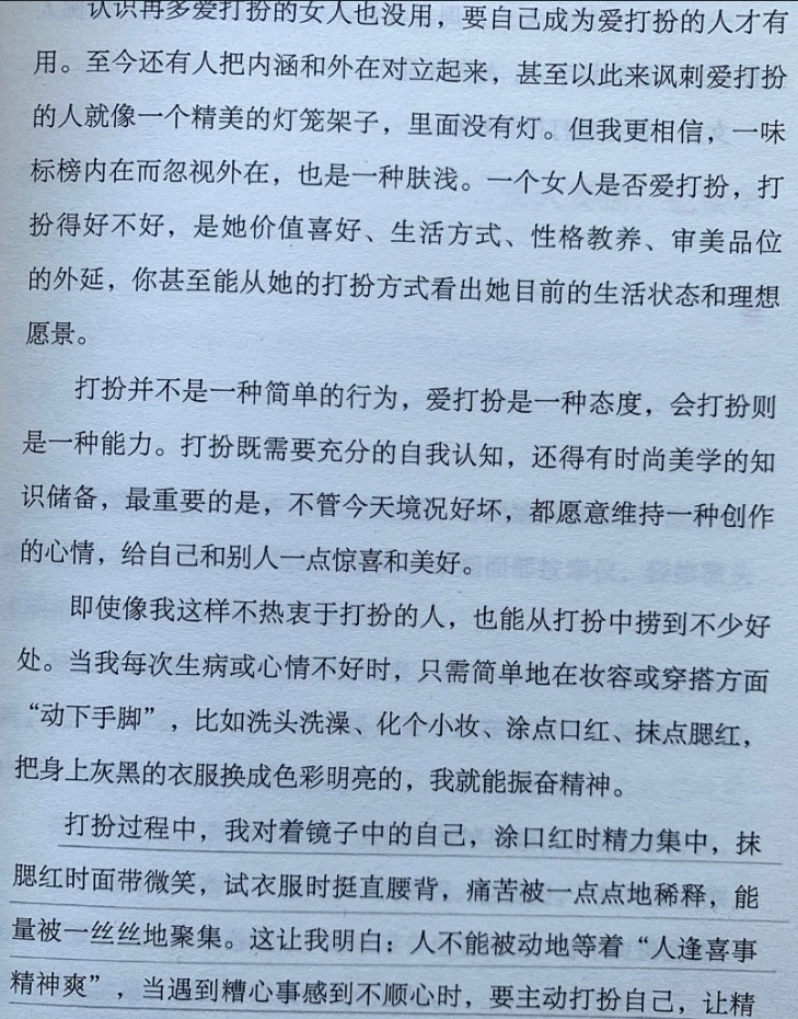 ❤️比如在“不要低估一个穿衣好看的女人”当中,她写道:永远不要小看任何一个穿衣好看的女人,她们从体态到肤色,饮食到健身,都散发着自律和坚持的迷人香味。穿衣越来越好看的女人,从外表看,是身材、肤质、仪态的全方位进步;从内在看,是自省、自知、自信的立体化升华。