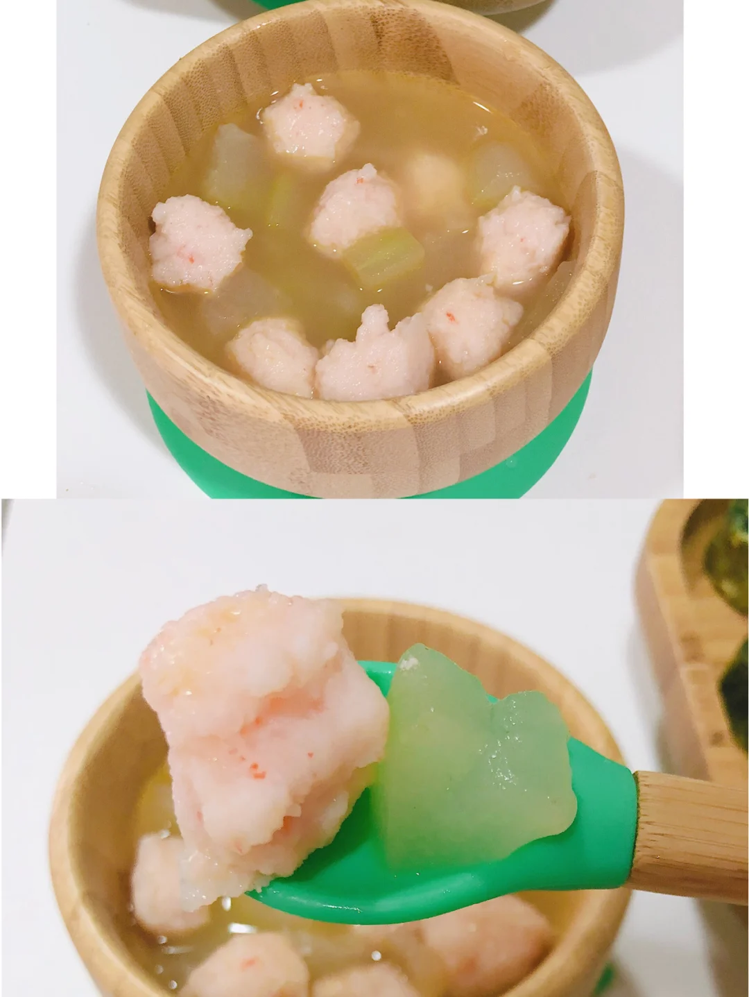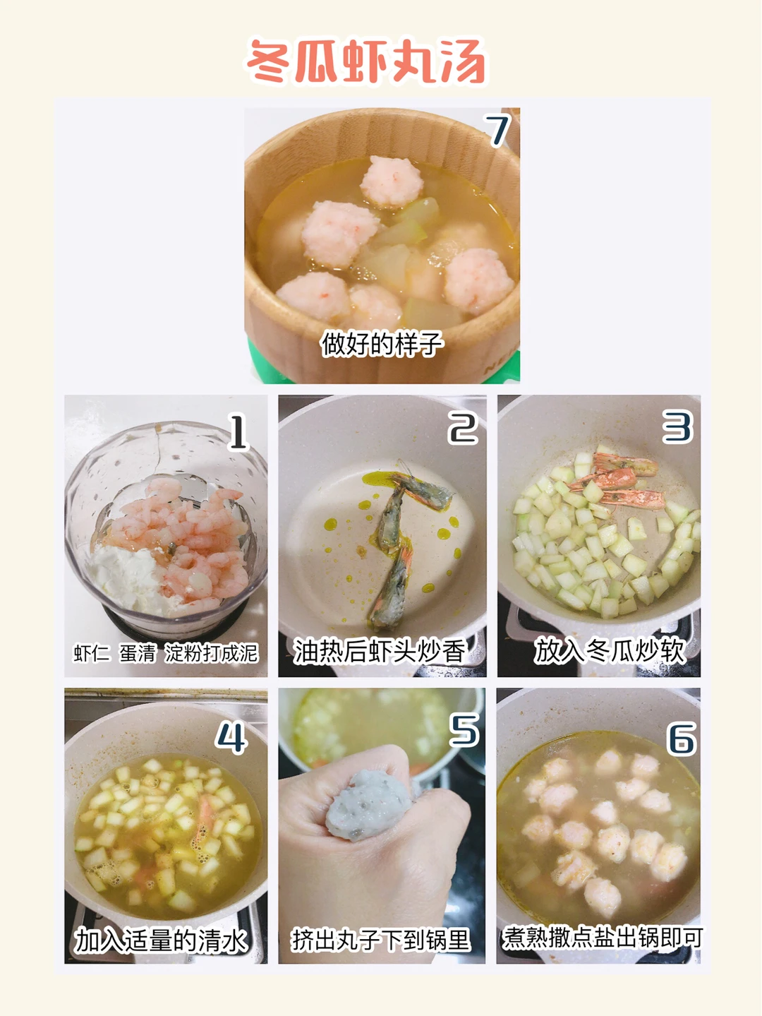 🎈锅中油热后,放入虾头炒香,倒入冬瓜丁,炒软后倒入适量的清水,煮开后转小火,用手虎口位置挤出丸子下到锅中,依次下完所有的丸子,转中火,虾丸飘起来,加入一点盐,关火即可。