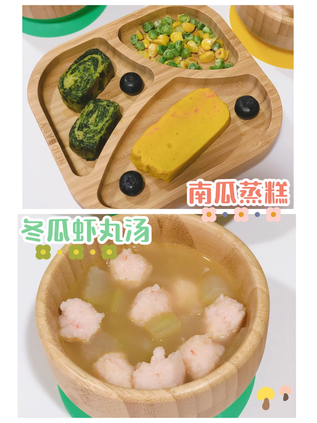 今天午餐:南瓜蒸糕 / 菠菜厚蛋烧/ 玉米豌豆/ 冬瓜虾仁汤