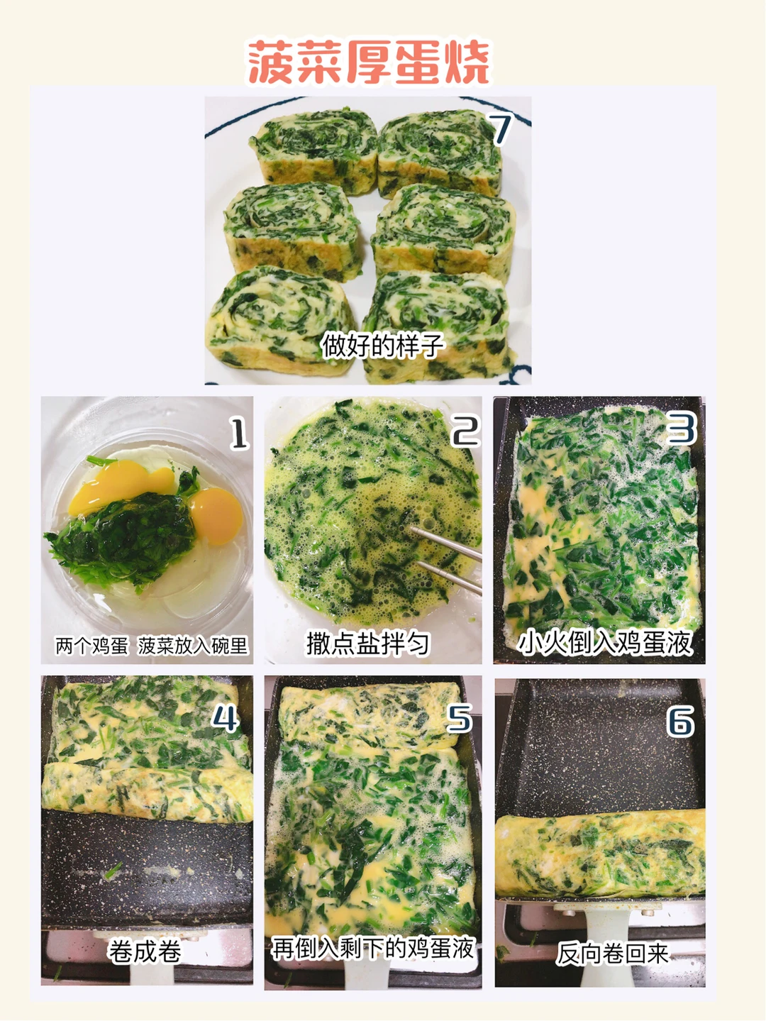 🎀菠菜厚蛋烧:两个鸡蛋 适量的菠菜,菠菜焯水切碎,和鸡蛋混合,锅中油热后,小火倒入鸡蛋液,待表面微有凝固,从一边卷起,卷成卷,再倒入剩下的蛋液,反方向再卷回来,各个面都煎一会,确保里面也熟透,煎熟后切成宝宝适合拿的大小即可。