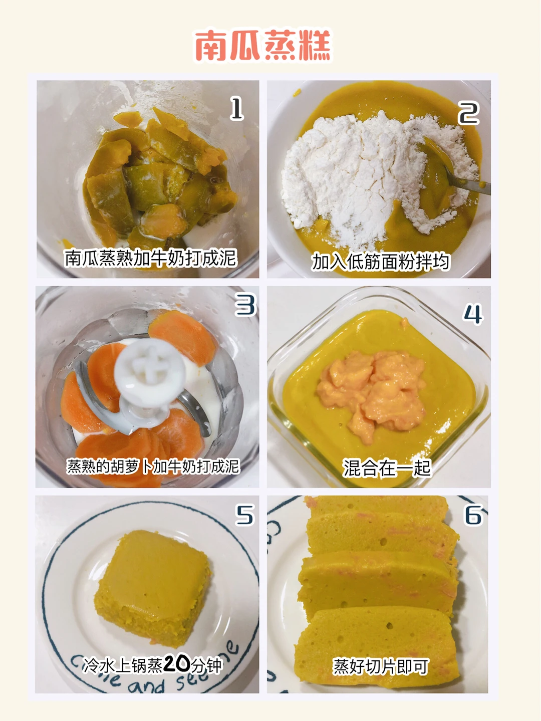 🎈蒸碗提前刷油垫上硅油纸,倒入南瓜胡萝卜泥,冷水上锅蒸20分钟,关火焖5分钟即可,待放凉一会脱模切成宝宝适合拿的大小即可.