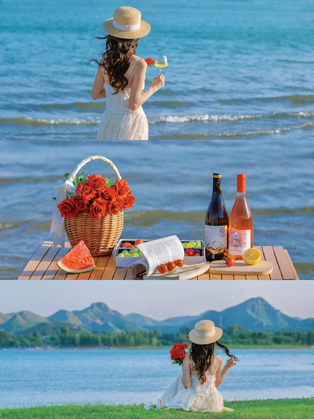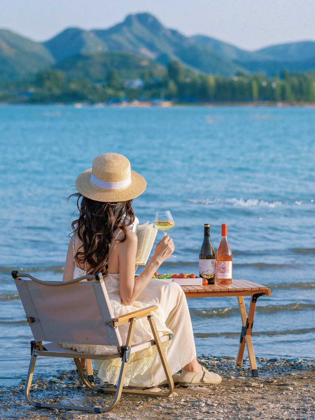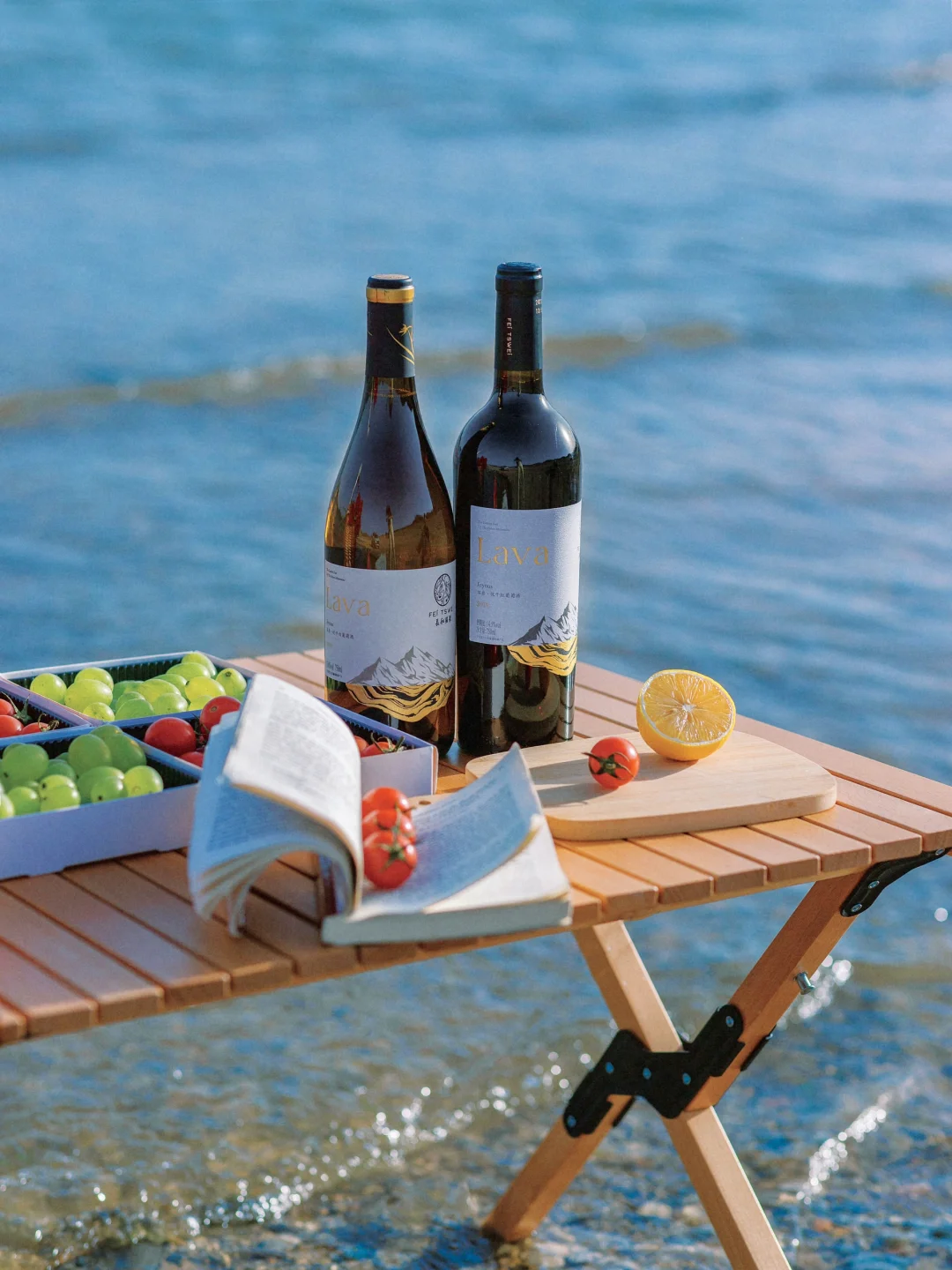 湖边拍照环境略显单调,所以这次露营特意带了花花和长和翡翠的桃红、熔岩·悦干白以及悦干红葡萄酒,恰好为拍照增添了色彩和生命力。