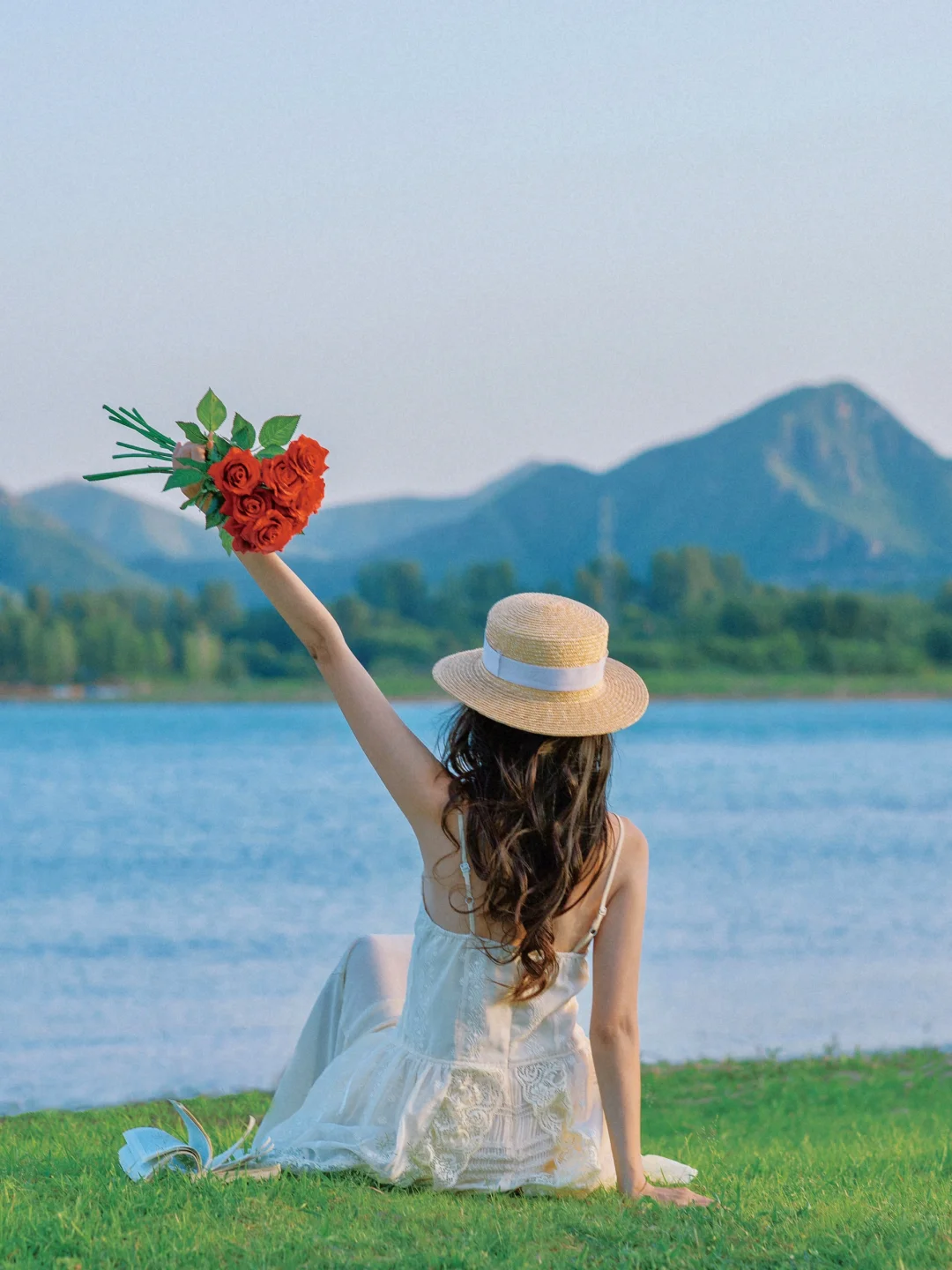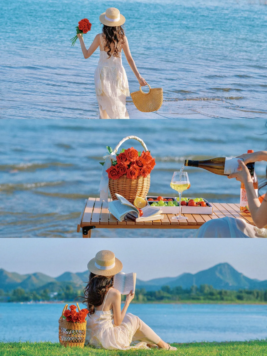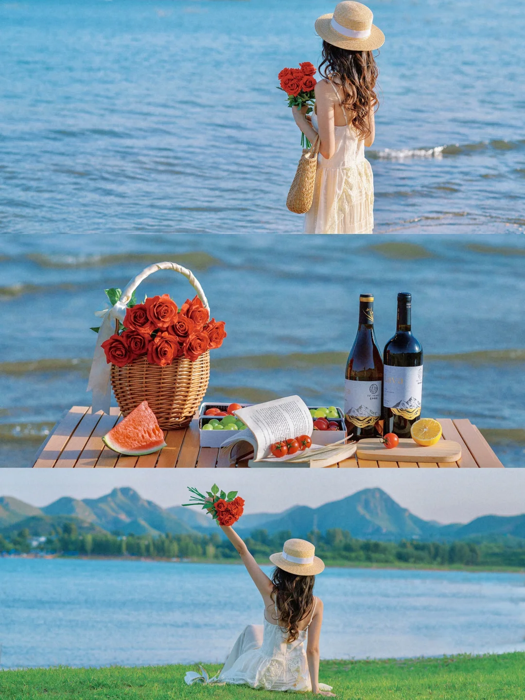 湖边拍照环境略显单调,所以这次露营特意带了花花和长和翡翠的桃红、熔岩·悦干白以及悦干红葡萄酒,恰好为拍照增添了色彩和生命力。