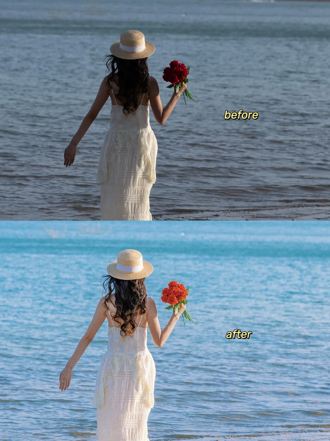 前期拍摄时机位选择侧逆光拍摄,夏天的光线较强,光比大,人物暗沉,湖面原图发灰没有色彩,可以通过以下几步,轻松调出色彩清新通透的照片啦~