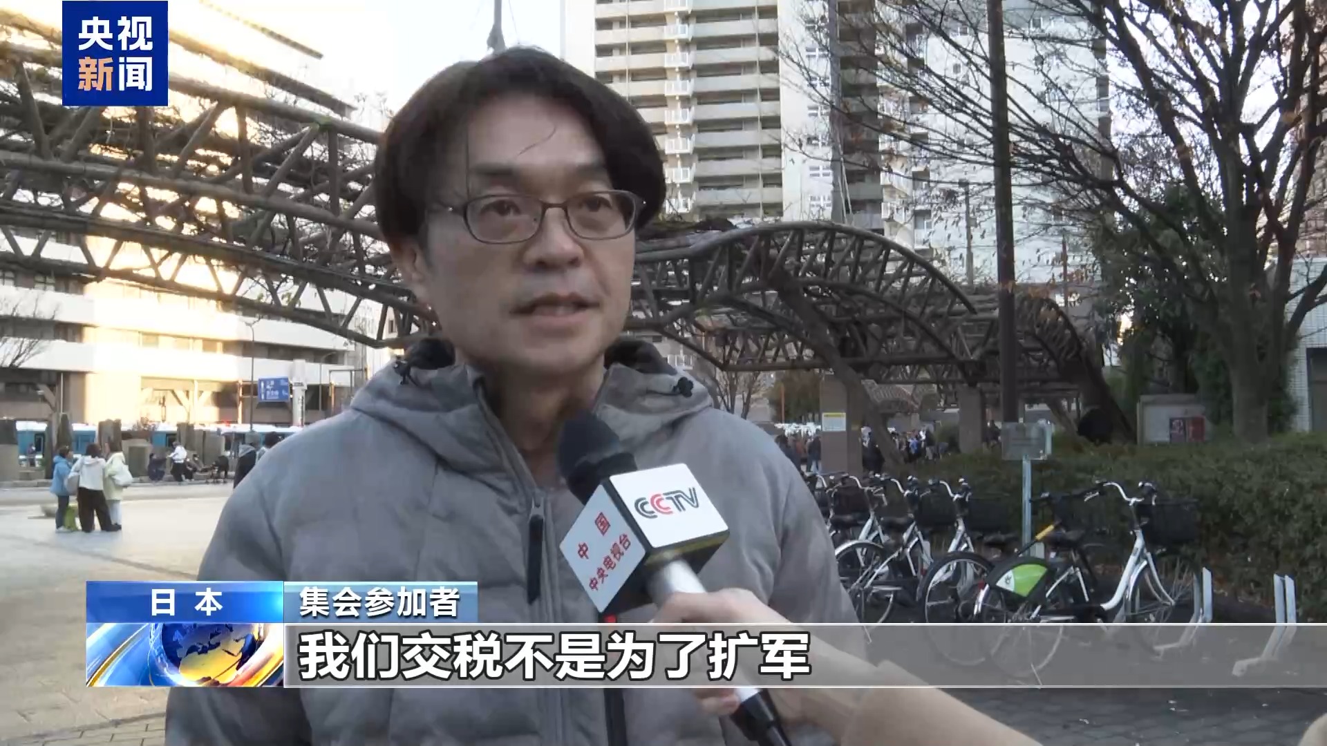 集会参加者:军事开支不断扩大,社会保障费用开始被削减,再加上即将启动的大规模增税,税金本应被好好用在民生领域。我们交税不是为了扩军,我对此表示反对。