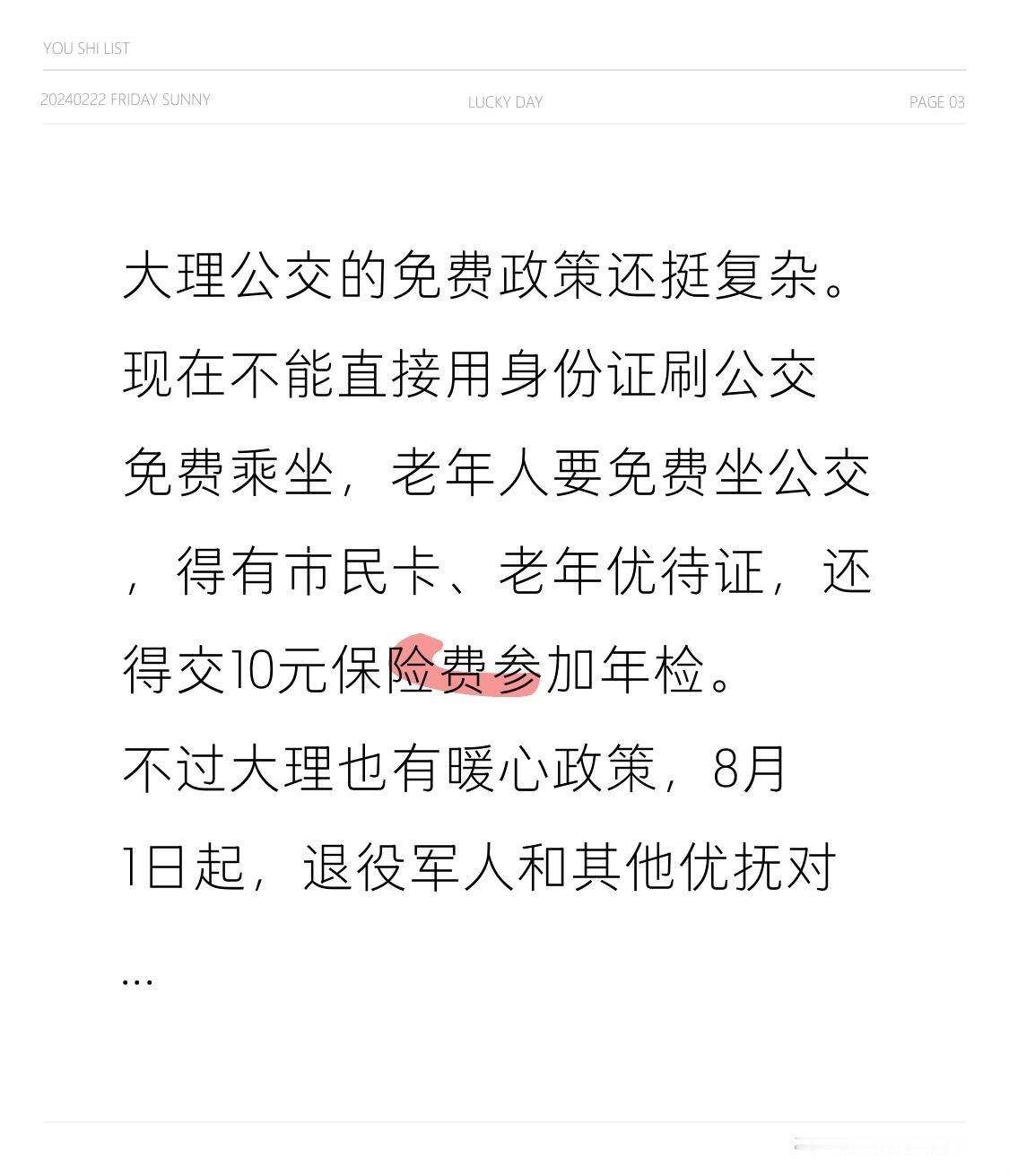 大理公交的免费政策还挺复杂。现在不能直接用身份证刷公交免费乘坐,老年人要免费坐公交需办老年卡。 🏷办卡所需材料大理市户口:云南省老年优待证、身份证、户口册、两寸彩色近照。非大理市户口:除上述材料外,还需提供满一年的《居住证》。 ❤️不过大理也有暖心政策,8月1日起,退役军人和其他优抚对象持优待证可免费坐市内公交,刷卡就行,比亮证方便多了。 另外,之前网友希望外地70岁以上老人免费乘公交,大理回应是办当地“老年乘车卡”就能免费坐。不知道云南省老年优待证新政出来后,会让大理老年人免费乘公交政策有啥变化,挺让人期待的。