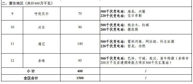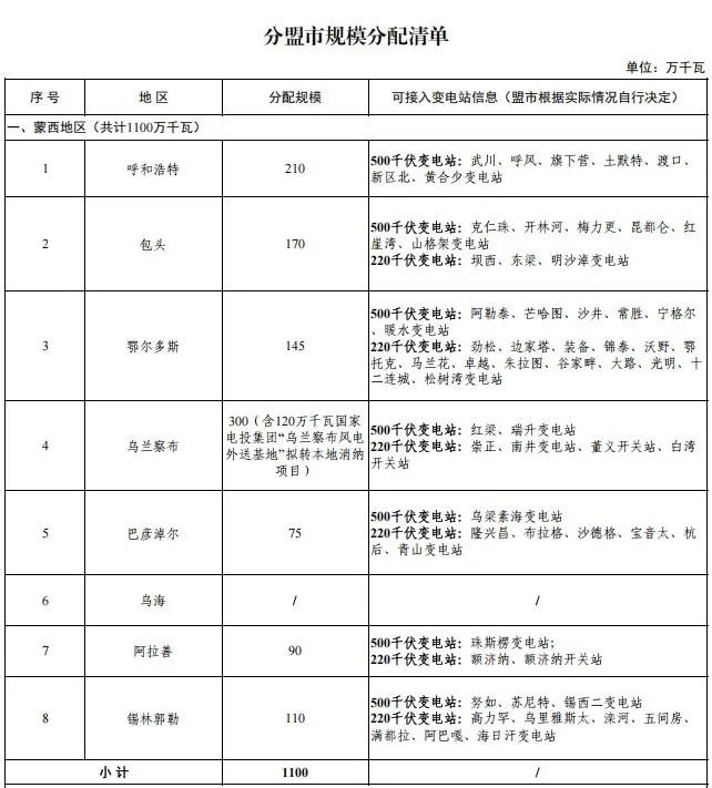 通知指出,根据全区非水可再生能源电力消纳权重目标,结合地区新能源利用率、电网接入条件等,以盟市用电负荷增速为主要依据,形成分盟市建设规模,共计划安排全区上网消纳风电项目建设规模1500万千瓦,其中,蒙西地区1100万千瓦,蒙东地区400万千瓦。