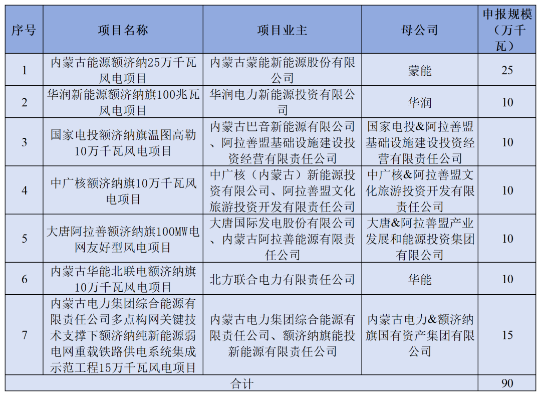 根据公示,阿拉善盟本次共确定7个风电项目,容量共计900MW。业主涉及蒙能、内蒙古电力、华能、华润等。