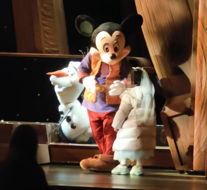 视频显示,在“米奇妙游童话书”表演过程中,一个小女孩突然跑上台,并靠近扮演米奇的演职人员,想要拥抱米奇。