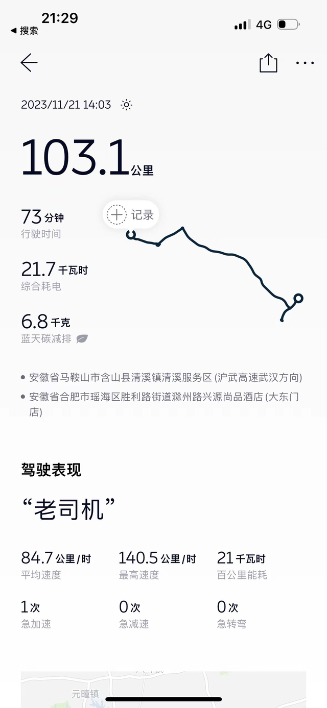 这是一整段400公里多点的路程能耗 从湖州太湖服务区,前往安徽合肥,本身是打算在太湖服务区换完电之后直达合肥的。奈何中途开错了路,导致路程多了好几十公里。只能选择在清溪服务区进行一次换电。 结果从清溪服务区出来又开错了一次,还好只多了大概20公里不到。 导致本身3个半小时的路程,最后开了4个多小时。 全程基本都是空调20-21度,QQ音乐,座椅按摩。 哪怕我们在前往清溪换电站已经是0%的电,过程中我们也都没有开启节能模式。 当然啦,这电耗肯定不算什么。不过自己开的还是挺舒服的。