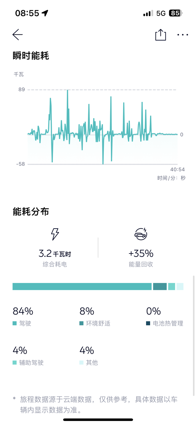 今天上班行驶里程 15公里,20.9千瓦时/百公里能耗 全程没有开自动驾驶,没有急加速,没有激烈驾驶。 动能回收:35%,设置为标准动能回收,习惯了Tesla model3动能回收,蔚来动能回收要做得缓慢一些,不过回收效率不错, 84%是用于驾驶,16%空调或其他事项 8%是空调, 4%辅助驾驶 4%其他就不知道代表啥 整体算比较正常的驾驶,确实电车比能耗意义不是特别大,因为冲电便宜,特别是有家充电的车主,一个月就200元左右电费。还电车省钱。