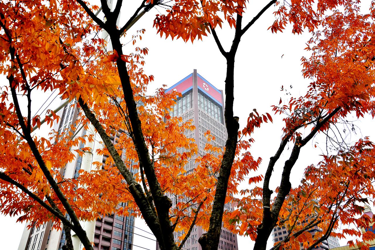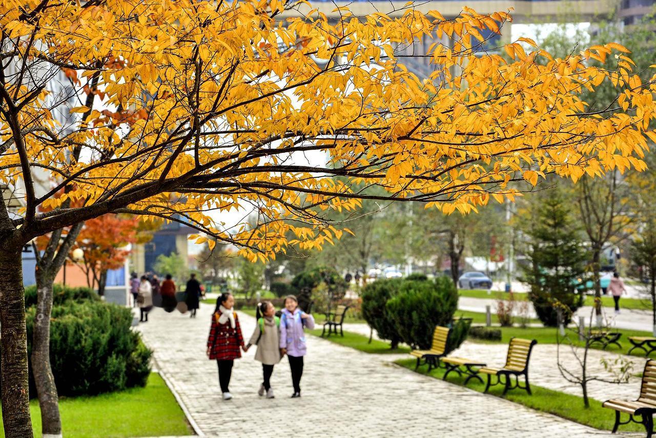 新街景 朝鲜首都平壤新建的和盛地区景色秀美。雄伟华丽的现代化大街和行道树染成黄金色、红色,显得更加漂亮。