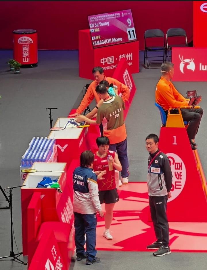 俩人狠狠撕[吃瓜群众], 安洗莹🇰🇷 开局那么猛,居然被山口茜反超了[吃瓜群众], 第一局安洗莹🇰🇷 9-11 暂时落后于🇯🇵山口茜,山口茜🇯🇵手感也太好了。 这是2025年世界羽联年终总决赛半决赛。 半决赛的对阵是由抽签决定的,同组选手不回避,所以同在A组的安子和马达又先遇上了。 评论区继续吃瓜围观哦[奸笑]。