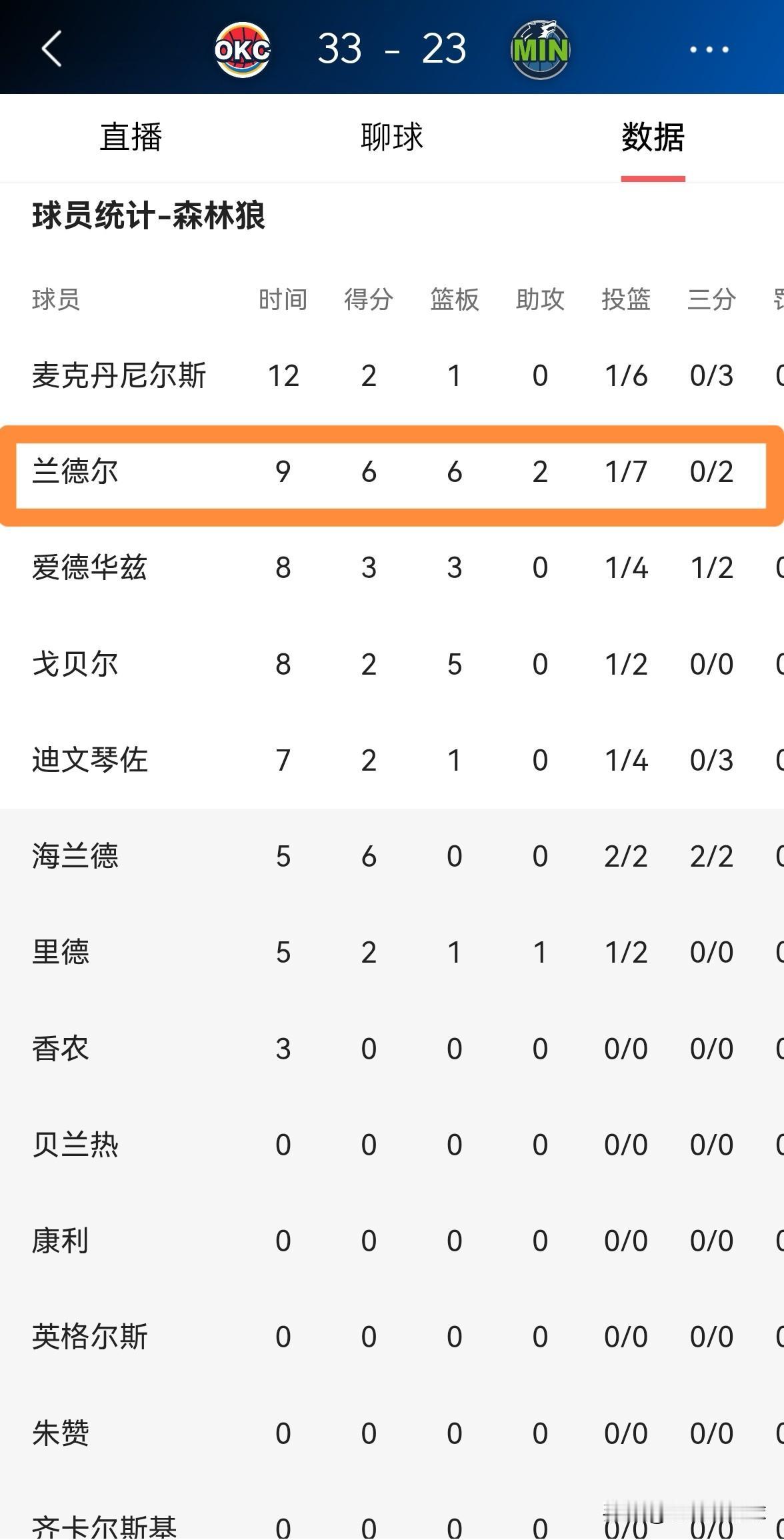 森林狼二当家兰德尔真是铁匠附体了!在今天森林狼主场迎战雷霆的比赛中,目前双方的第一节比赛已经结束,森林狼以23:33落后于对手。在首节比赛中,兰德尔首发出战9分钟,投篮7中1,其中三分球2中0、罚球6中4非常低效的得到6分,他的场上正负值为全队最低的-12。 作为一名内线球员,对于兰德尔如此低的投篮命中率,我真是无法理解。
