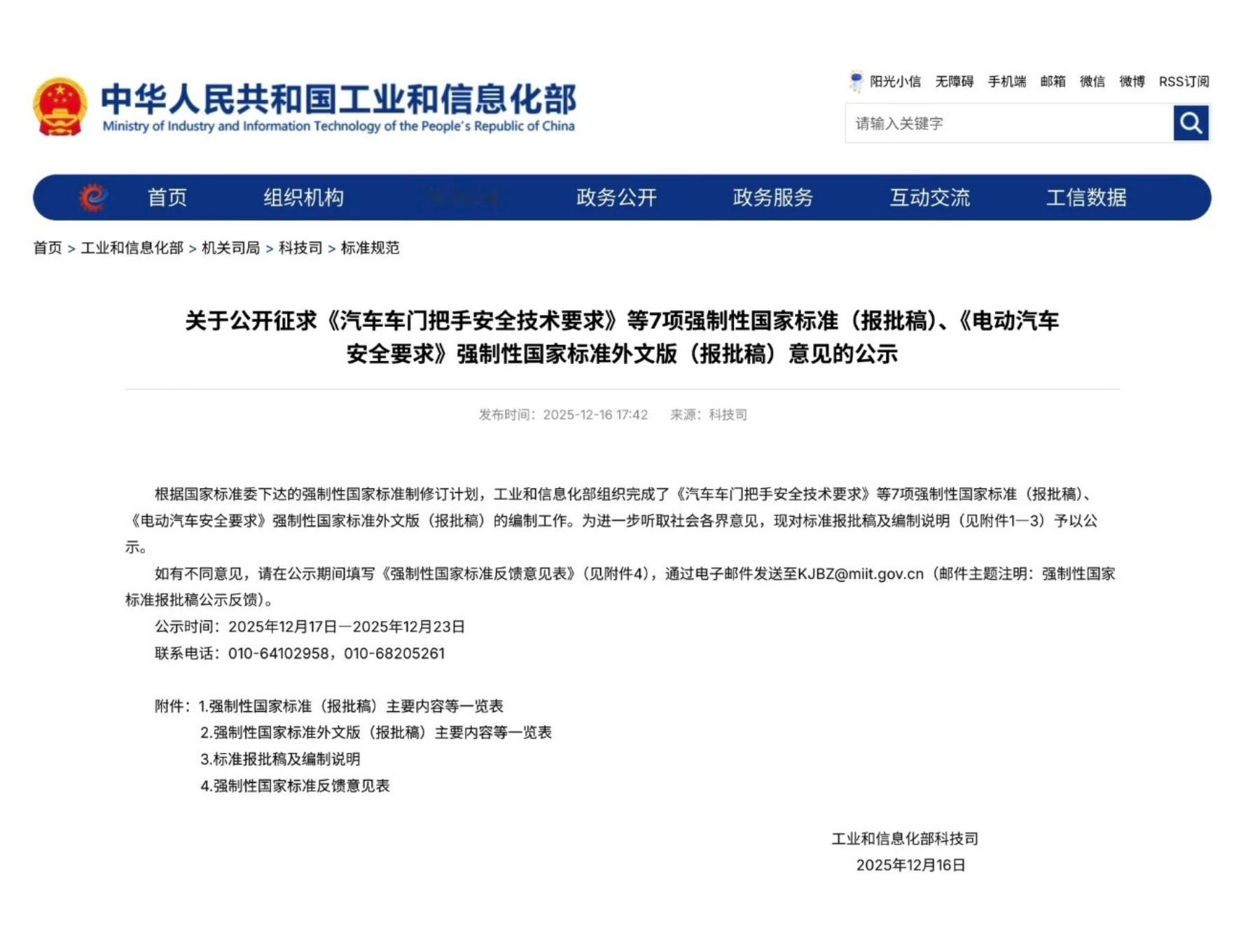 明确禁止全隐藏式门把手 为门把手新国标疯狂点赞!终于不用为全隐藏门把手闹心啦~ 2027年1月新规一实施,不管啥情况都得留机械扣手,徒手就能开门!之前冬天冻住就算了,事故断电打不开才要命。比起华而不实的科技感,逃生救援的安全感才是刚需啊!这波是汽车设计回归安全本质,实用永远比噱头重要,必须为工信部的硬核规范打call~