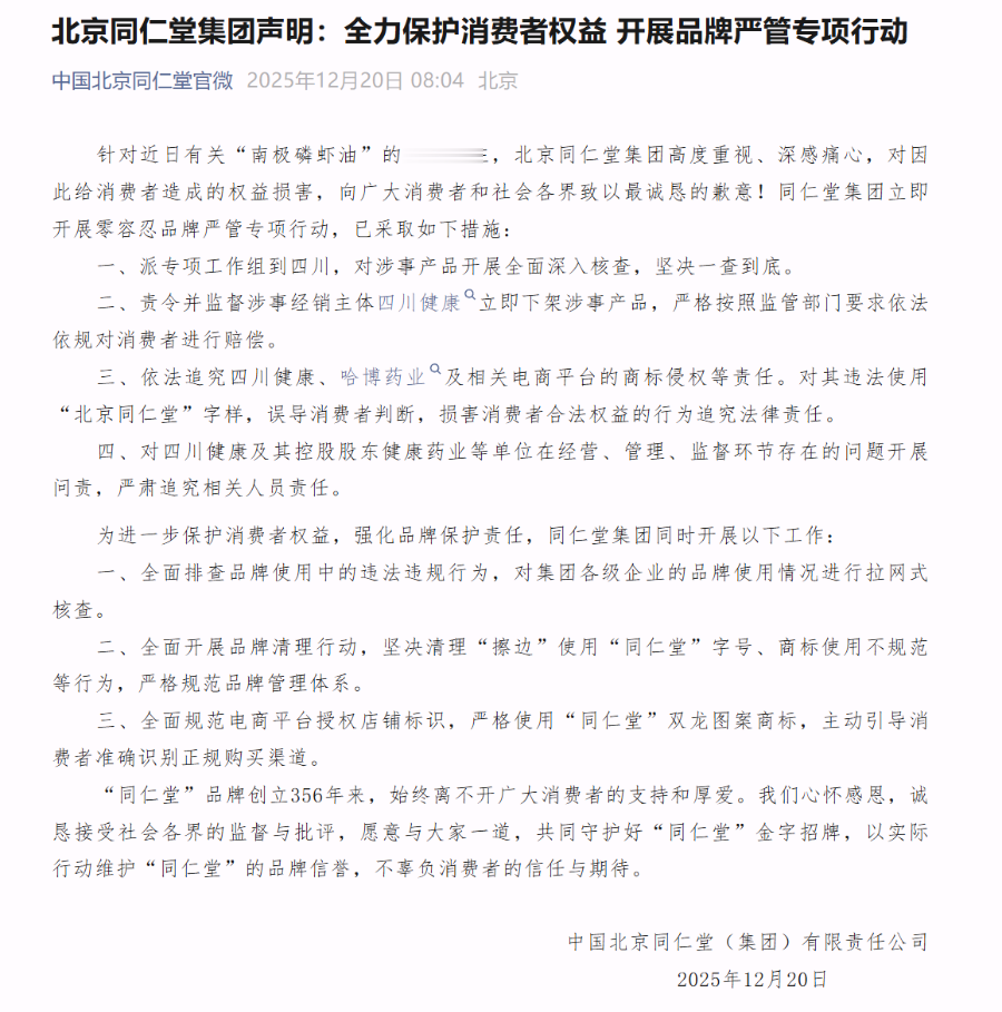12月20日,同仁堂集团发布致歉声明称,针对近日有关“南极磷虾油”的舆论关注,集团对因此给消费者造成的权益损害,向广大消费者和社会各界致以最诚恳的歉意。