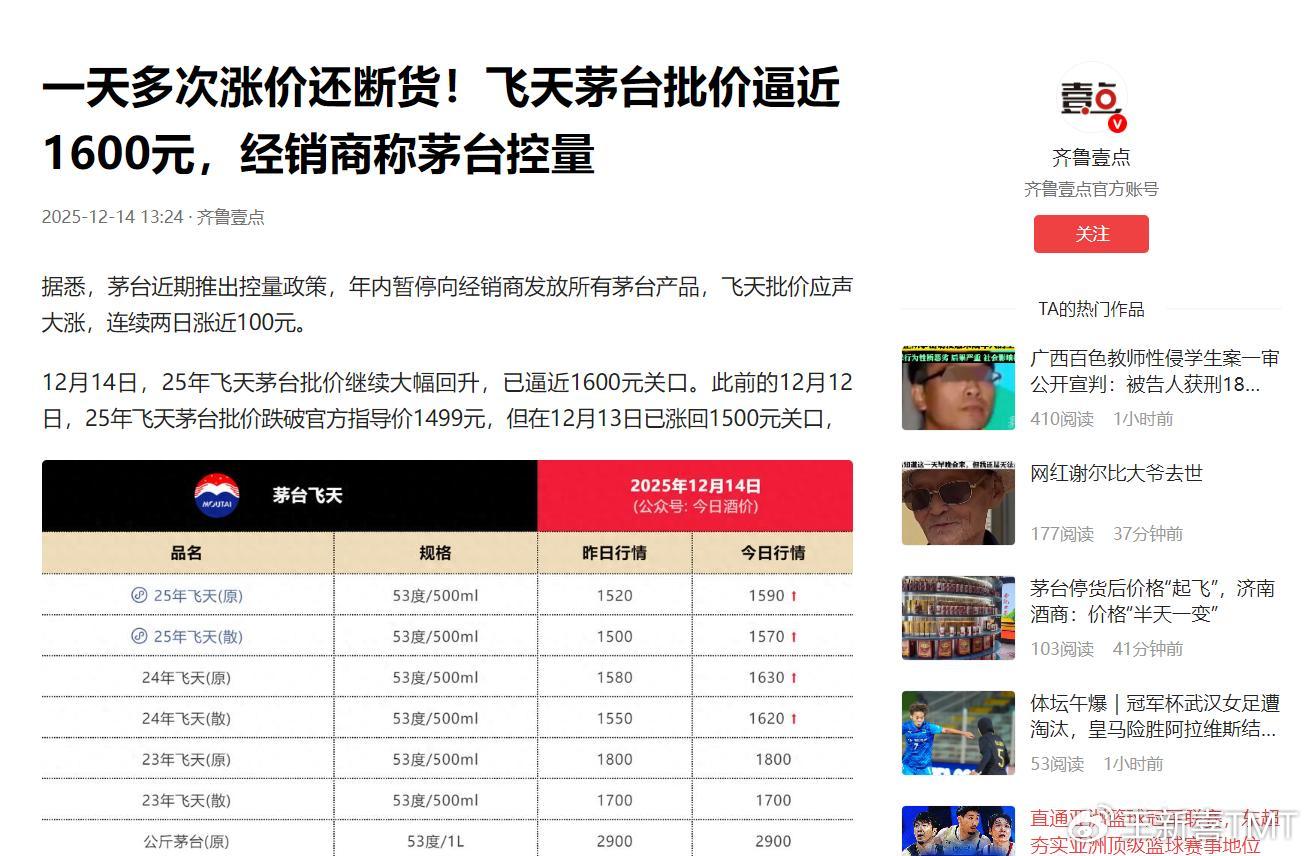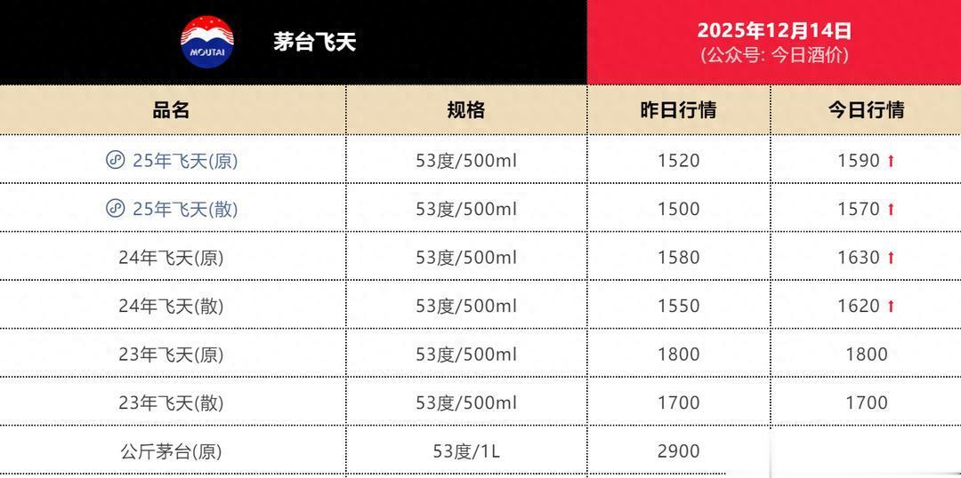 根据北京日报的报道,飞天茅台酒一天内4次上调价格。12月13日,飞天茅台酒(2025年)的价格跳涨了4次,18点左右,拿货价格都达到了1580元/瓶。