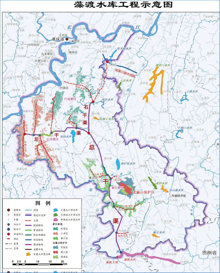 藻渡水库坝址坐落于长江右岸一级支流綦江上游支流藻渡河上,是一座以防洪、供水、灌溉为主,兼顾发电等综合利用的水利工程,是国家172项节水供水和国务院150项重大水利工程之一,是渝黔合作中投资规模最大的水利工程。项目由重庆市水利局、重庆水务环境集团监督管理,中交上海航道局有限公司、中交第二航务工程局有限公司和长江勘测规划设计研究有限责任公司联合实施。工程批复总投资101.23亿元,总工期为60个月,水库正常蓄水位375米,总库容2.01亿立方米,可向重庆市綦江区、万盛区、巴南区及贵州省遵义市桐梓县供水约1.79亿立方米,新增灌溉面积17万亩,改善灌溉条件。水库利用下泄生态流量和弃水发电,电站装机1.2万千瓦,年均发电量4494万千瓦时。