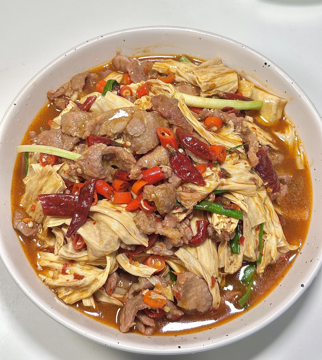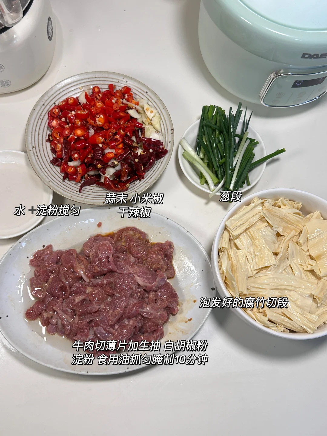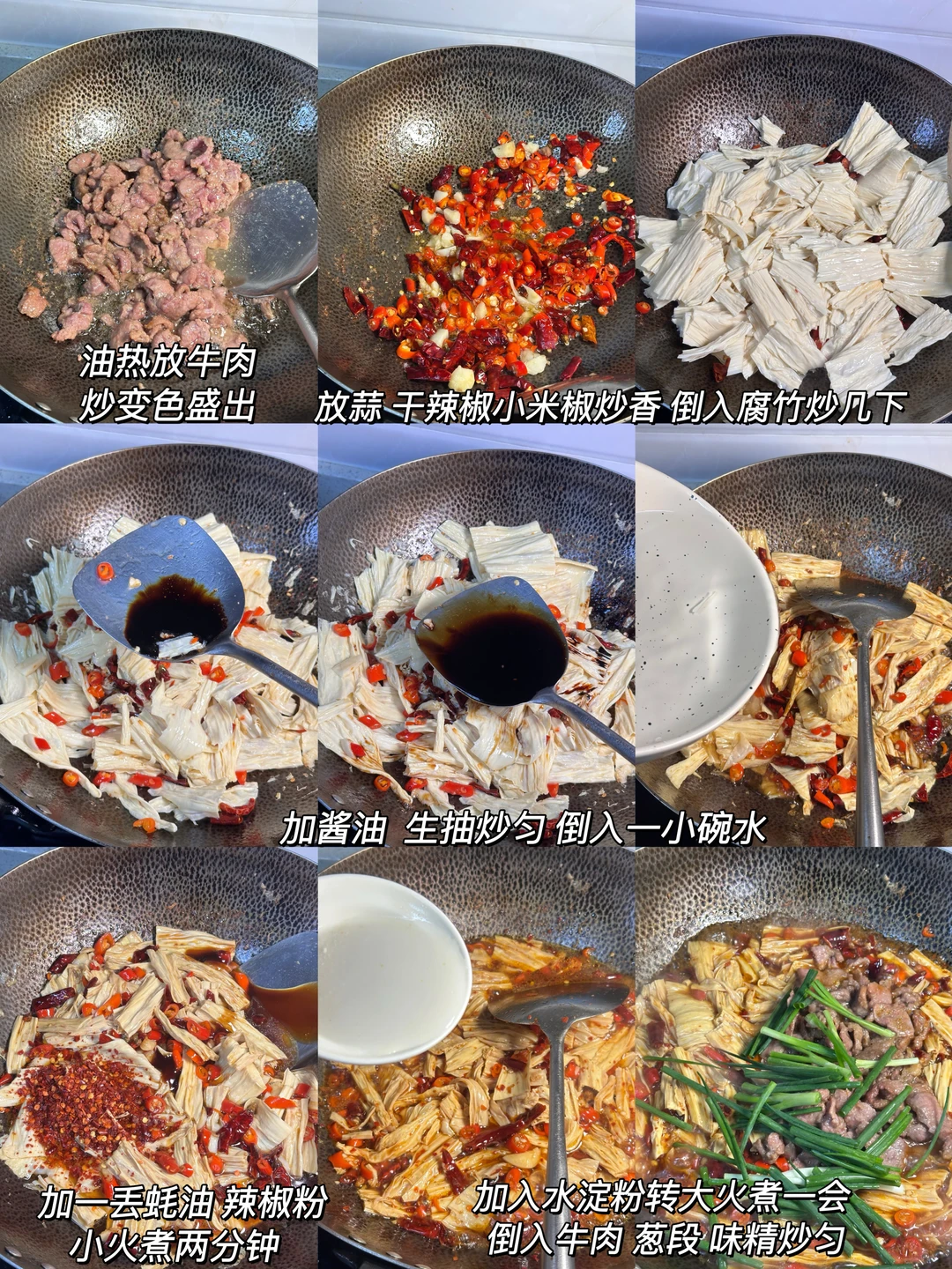 腐竹炒牛肉 ,软嫩的腐竹吸饱了汤汁,跟米饭绝配。爱吃腐竹的试试这个做法 ~ ✨食材:腐竹 牛肉 蒜 小米椒 干辣椒 葱段 1️⃣:牛肉加生抽 白胡椒粉 淀粉 食用油抓匀腌制10分钟 锅里倒油烧热 放牛肉快速炒变色盛出。倒入蒜 辣椒炒出辣味,再放腐竹炒几下 加生抽 酱油炒匀。 2️⃣:放一小碗水 一丢蚝油 一勺辣椒粉中火煮几分钟 。煮到汤汁还剩一点的时候放入水淀粉 (放之前搅拌一下 会沉淀)转大火煮一会 ,再把牛肉放进去,加葱段 味精炒匀。 好好吃饭呀🖖🏻