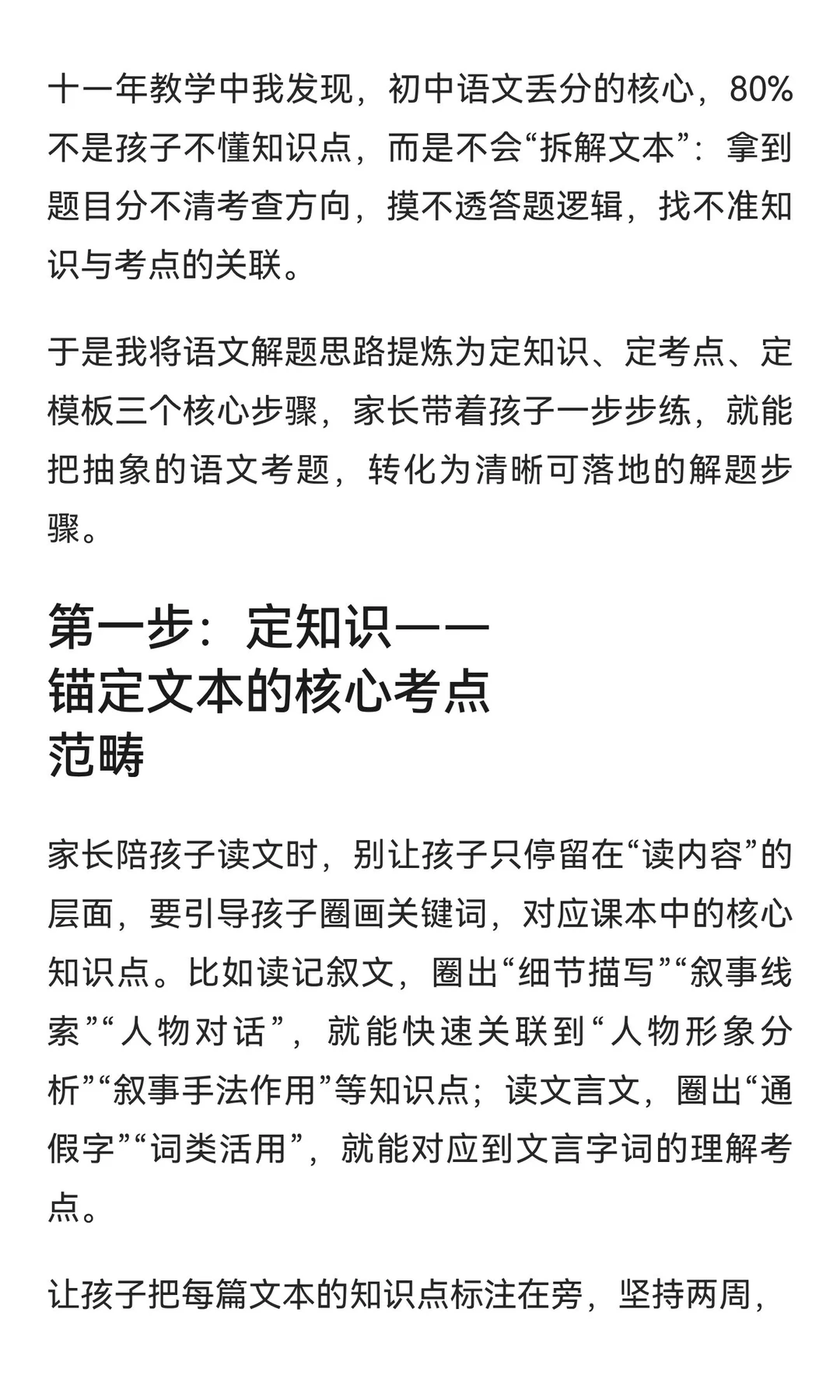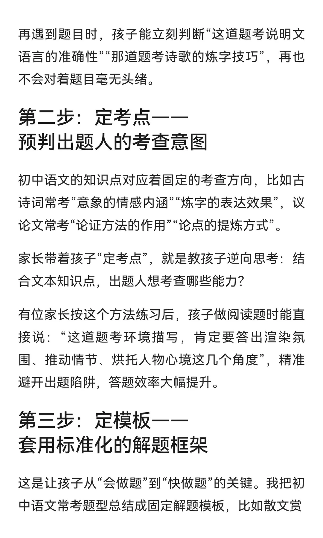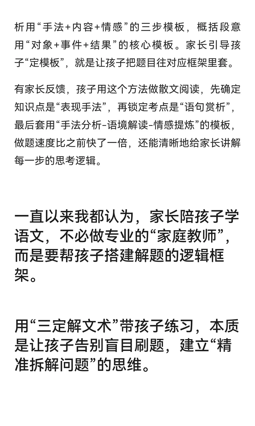“三定解文术”通过定知识、定考点、定模板,帮助孩子高效解题,提升语文成绩。家长引导孩子拆解文本,明确考查方向,套用标准化模板,避免盲目刷题,培养主动学习能力。
