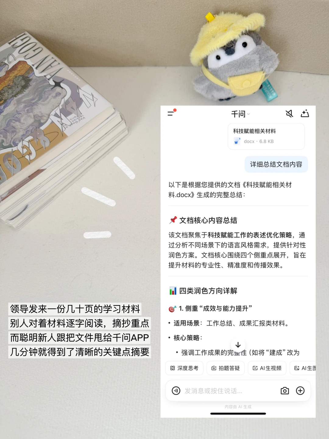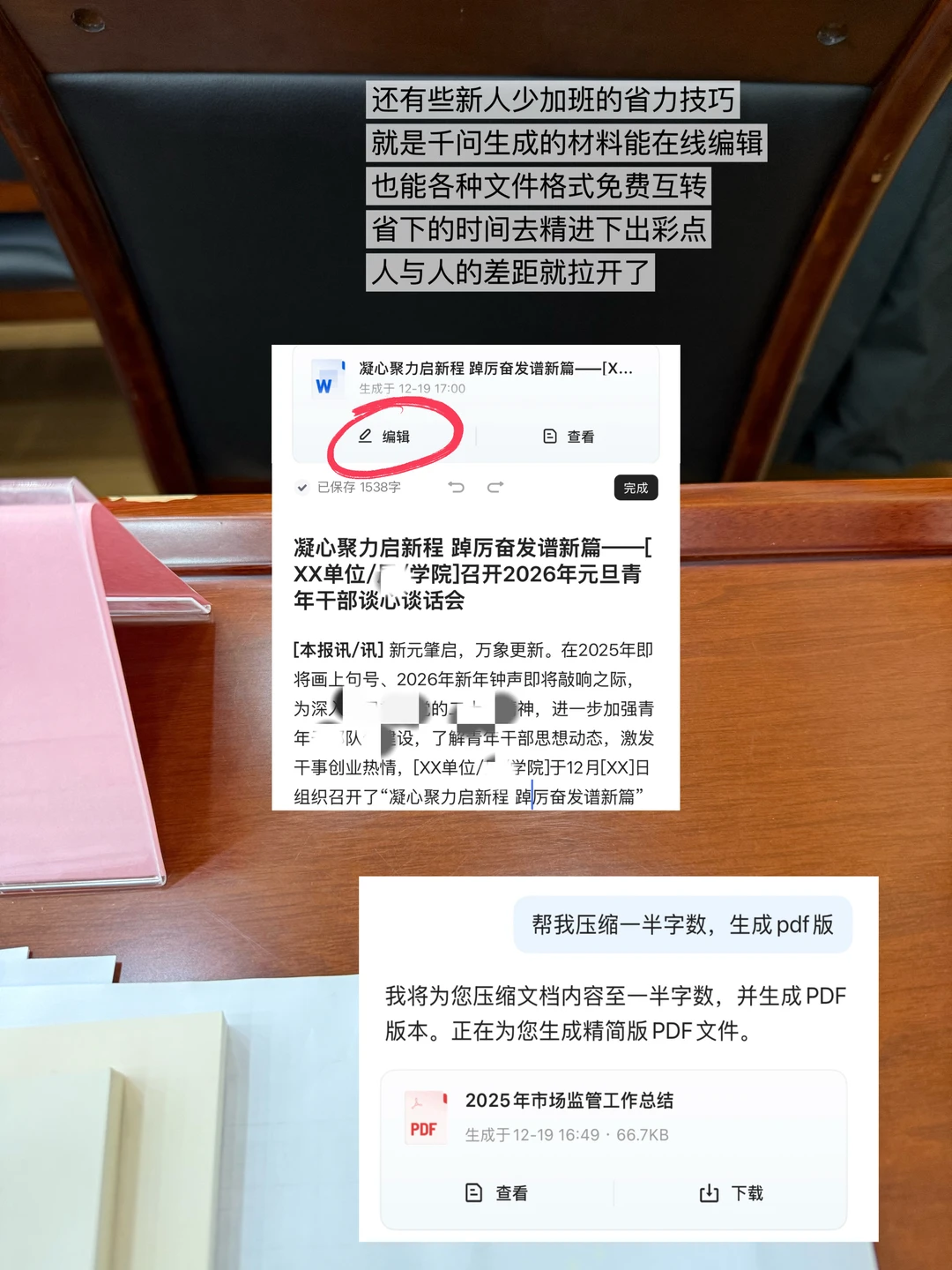 一次领导发给他们一份几十页的通知文件提取要点。小B对着PDF逐字阅读,摘抄重点,花了整整一下午。而小A则跟我们很快学会:把文件直接丢给AI软件千 问几分钟就得到一份清晰的关键点摘要[电影R],我们还能在线编辑、转PDF格式,省下的时间,去请教了老同事执行难点和出彩点,汇报时有理有据有想法,结果可想而知。