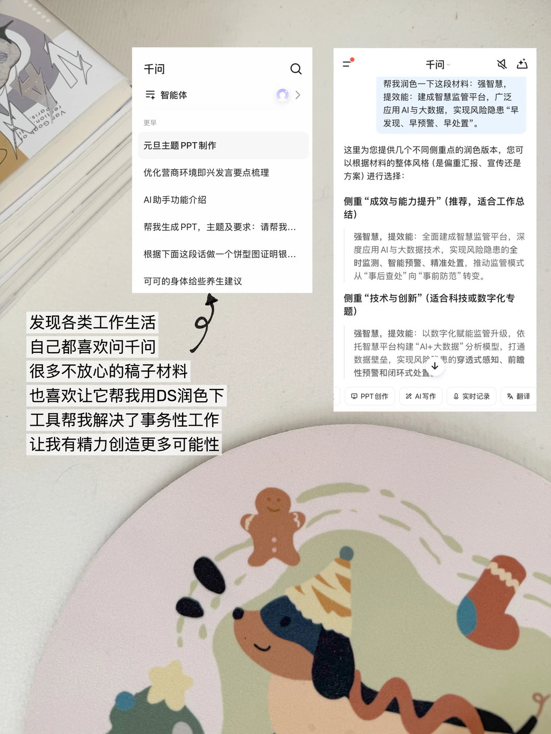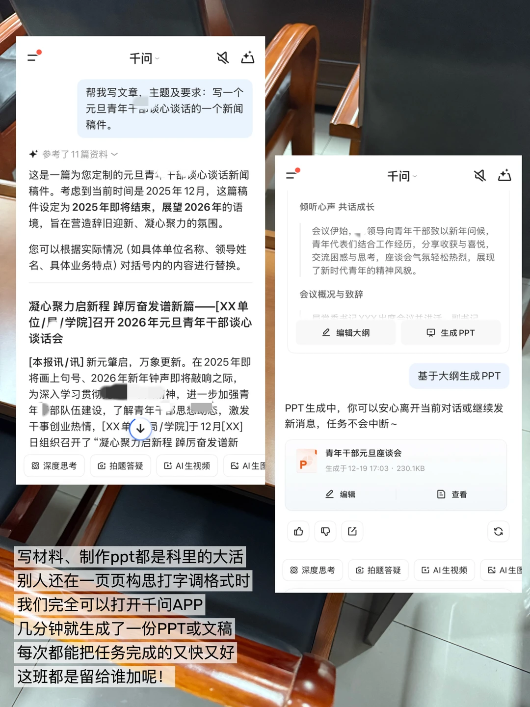 写材料再制作ppt是科里大活。小B一页页构思、打字、找图,一直深夜加工。小A打开各种AI,我们用千 问得到了一份结构清晰、标题赞的大纲,一键生成很多模板和格式的PPT,文字图片还分别用DeepSeek 润色和Nano Banana做了修改并在PPT里直接更换?汇报时的画面超赞,有时候就是这样,工作不会因为你花时间而更好。