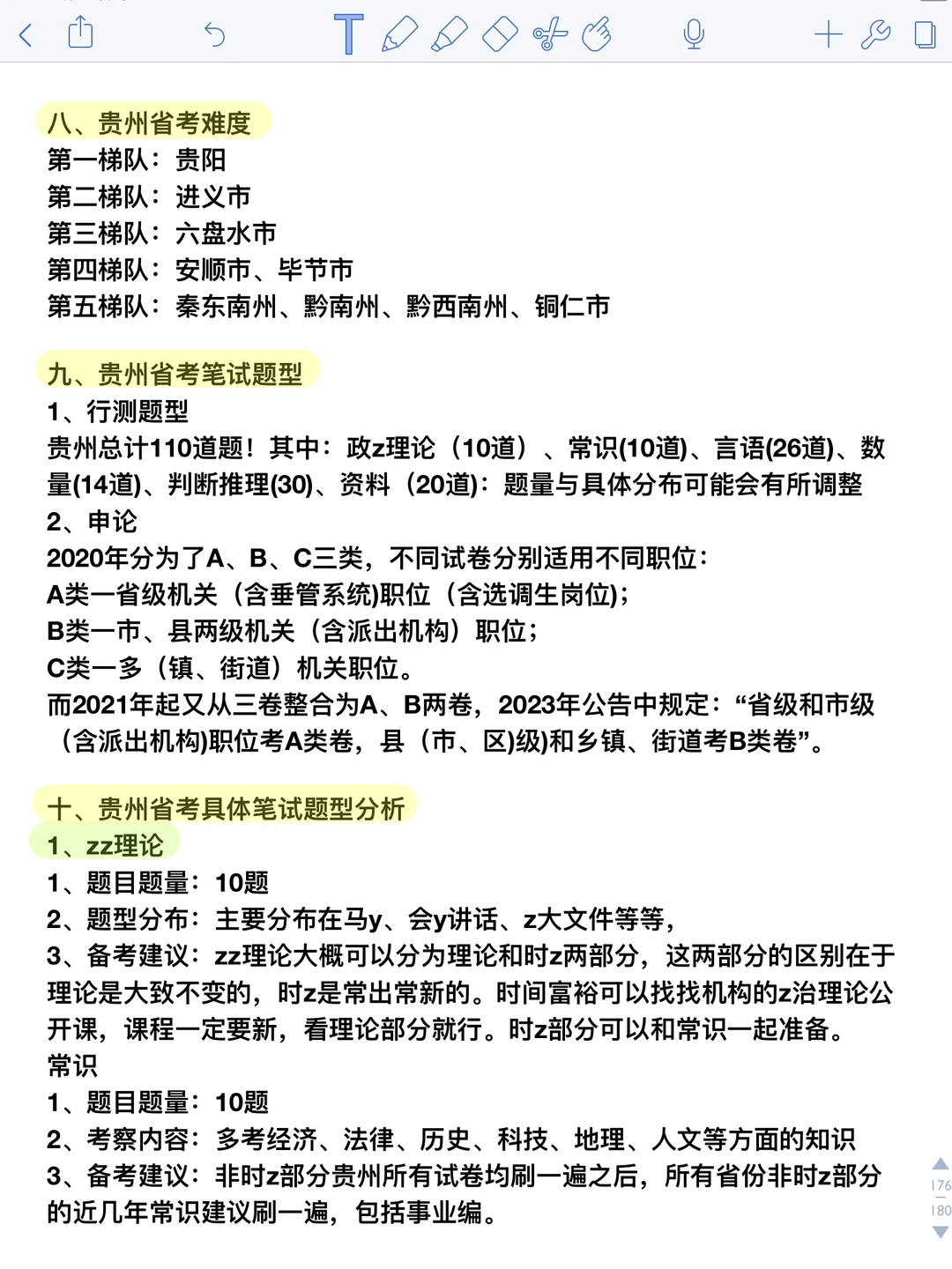 什么都不懂就开始备考贵州省考真的会做很多无用功!备考有方向!码住! - 🍉提供一些备考方向: [一R]贵州省考招考公告查询 [二R]贵州省考报考条件 [三R]贵州地区公务员待遇 [四R]贵州省考难度 [五R]贵州省考基本流程 [六R]贵州省考重要节点 [七R]贵州省考如何选岗 [八R]贵州省考笔试题型 [九R]贵州省考怎么备考 - 🎯备考规划 1⃣基础阶段 1.跟系统课程至少过一遍,对各个模块内容、重难点、出题逻辑有清晰的认知 2.晨读背诵:半月t上面的时政热点积累申论素材 3.每天题量:言语25判断35数资25常识15 4.申论行测同时进行,申论在前期可以少但不能不练 - 2⃣ 专项拔高阶段 根据自己的薄弱模块去找固定的老师听课,选择适合自己的名师 1.判断:花生十三判断刷题、龙飞图推刷题 2.言语:郭熙100题、欣说、阿里木江刷题 3.数量:花生十三数量1200题、高照数量专项训练、齐麟刷题(练常考题型) 4.资料:高照超大杯、齐麟、花生十三 5.常识:FB(分模块刷) 6.申论:李梦圆、站长申论刷题(每天一套,每周一篇大作文) 每天言语30题+判断30题+数资30题+常识15题 - 3⃣刷题冲刺阶段 1.行测:花生十三两期套题冲刺、常识时z、热点课 2.申论:站长申论真题班 上午行测下午申论,晚上解析和复盘近10年国考和省考的真题,考前刷3遍,总结错题查漏补缺 - 4⃣考前冲刺阶段 1. 严格按照考试时间,早上一套行测,下午一套申论,写在答题纸上。晚上复盘,保持状态到考前。 2.错题集完完整整的再过至少3遍,不同颜色重新标记难点和知识模糊点,对于变型较多 /复杂的题型,重点关注 - 希望这份梳理能帮助大家更清晰地了解贵州省考,明确备考方向!祝各位备考顺利!