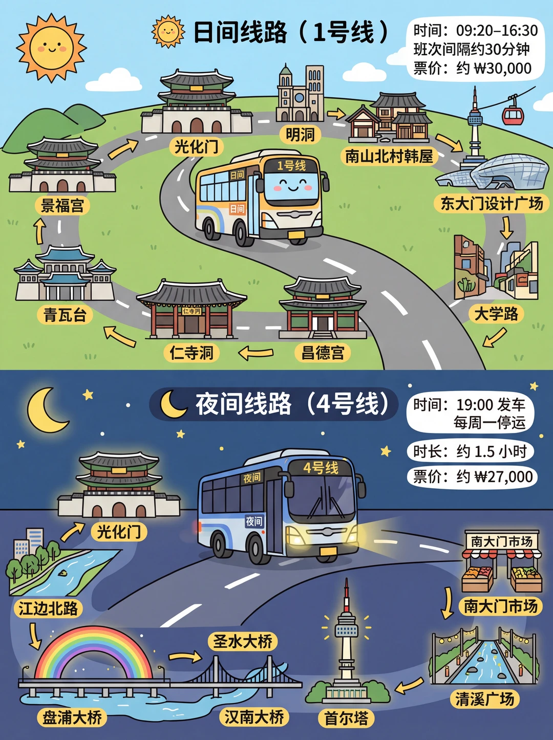 ✅首尔塔夜景:巴士在此停留约20分钟,可从容欣赏并拍摄璀璨城景。