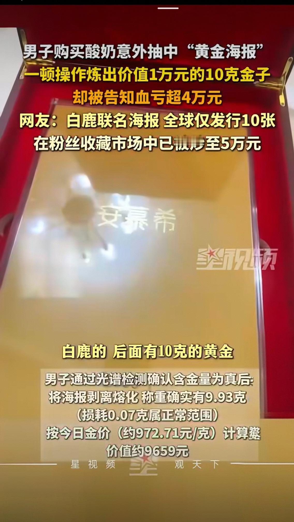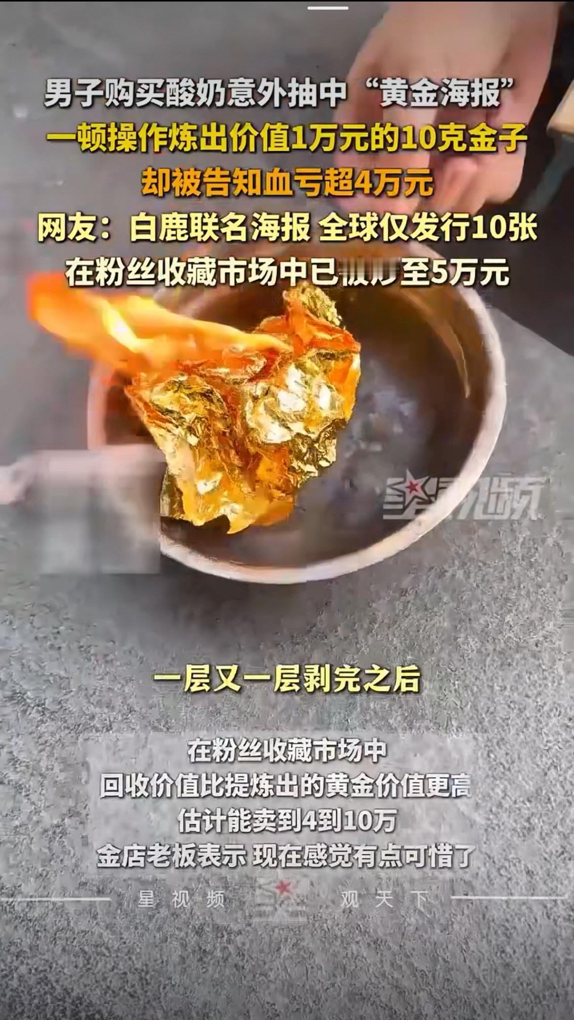 男子抽中白鹿黄金海报,熔成10克黄金血亏4万!网友:这波操作太心疼 近日江苏南京一男子购买酸奶,意外抽中“黄金海报”,其印有代言人白鹿的形象,并标注有“999足金10g”。 捧着这张金灿灿的海报,男子心里乐开了花。他琢磨着黄金最实在,与其留着一张不能吃不能喝的海报,不如熔成金条来得划算。说干就干,他找了家金店,一番操作下来,海报真的被炼成了一块10克的纯金,按当下金价一算,足足值1万块! 正当他美滋滋地跟朋友炫耀自己的“好运气”时,一个晴天霹雳砸了下来——有人告诉他,这张白鹿联名黄金海报全球仅发行10张,在粉丝收藏市场早就被炒到了5万元的天价! 1万和5万,整整4万元的差价,瞬间让男子的喜悦变成了欲哭无泪。 这事传到网上,直接炸开了锅。有网友哭笑不得地调侃:“这怕不是现代版的‘买椟还珠’,主打一个精准避开所有正确选项!”还有粉丝心疼得捶胸顿足:“那可是全球限量10张的海报啊!别说熔了,我连折个角都舍不得!” 也有人理性分析:其实这事儿说到底,就是“实用主义”和“收藏价值”的碰撞。男子眼里,黄金是实打实的财富;但在粉丝眼里,这张印有偶像的限量海报,是千金不换的情怀。 更有意思的是,这件事还戳中了很多人的心声:我们总在生活里做着各种各样的选择,有时候以为自己占了便宜,殊不知,错过的可能是更珍贵的东西。 当然,也有网友替男子打抱不平:“人家自己的东西,想熔就熔,千金难买我乐意!”这话一出,又引来一波新的争论。 说到底,这10克黄金没亏,但那份独一无二的收藏机遇,确实再也找不回来了。你觉得男子这波操作亏不亏?要是你抽到这张海报,会选择熔掉还是珍藏?