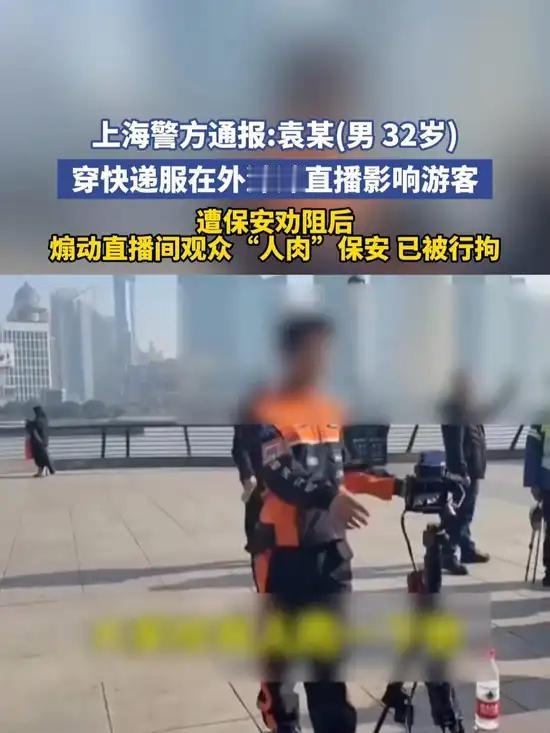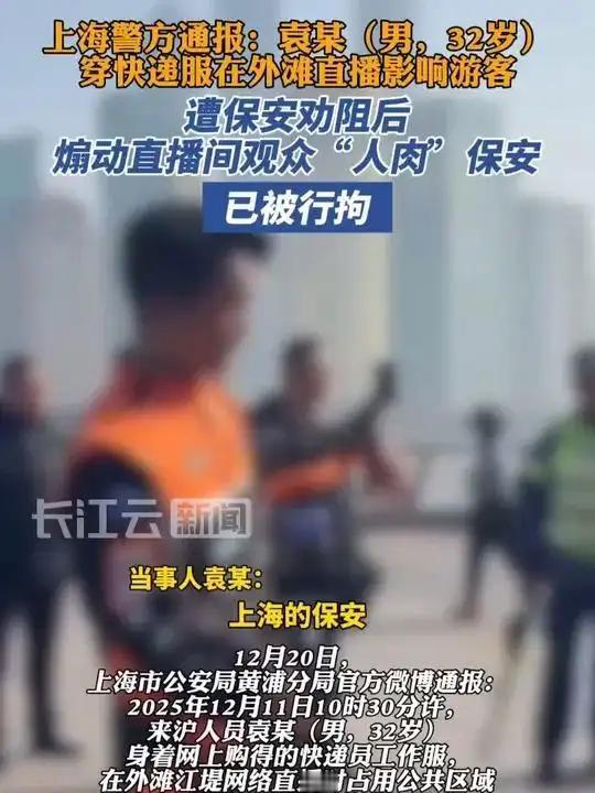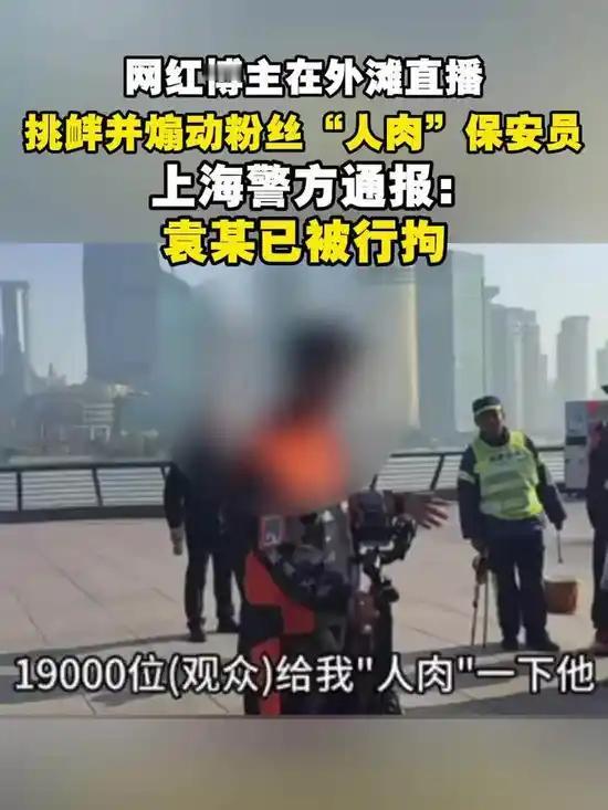 网红穿“工服”外滩直播闹剧:煽动“人肉”终被拘 12月20日,上海市公安局黄浦分局的一则通报,揭开了一场闹剧的真相。 12月11日10时30分左右,来沪的32岁男子袁某,身着网购的快递员工作服,在上海外滩江堤搞起了网络直播。外滩本就是游客云集之地,他这一占公共区域,直接影响了游客通行秩序。外滩风景区保安员见状,赶忙上前劝阻。 可袁某呢,不仅拒不配合管理,还言语挑衅保安,甚至煽动直播间19000多位观众“人肉”保安,还嚣张地喊“来打我呀”。保安无奈表示只是正常管理,随后警察赶到现场。 其实,此前就有相关视频在网络传播,网红博主“帧十八”(即袁某)穿着所谓外卖工服在外滩观景平台直播,被保安劝阻后就上演了这出闹剧。12月15日,上海黄浦警方对他进行了教育告诫后放行。12月16日,外滩风景区管理办公室称,袁某直播占据观景道、引发游客围观,严重影响正常游览,保安劝阻遭拒后由警察训诫劝离。管理办公室还明确表示,对于怪异直播、占用公共设施影响游客等违规行为,会采取管理措施,拒不配合将上报公安处置。 这出闹剧的后果很快显现。12月16日下午,袁某的快手账号因违反《快手社区管理规范》被封禁;17日上午,其抖音账号也被封禁。而如今,袁某更是为自己的所作所为付出代价,被警方依法处以行政拘留。 警方也借此提醒大家,在公共区域直播要遵守规定,不得扰乱公共秩序,煽动“人肉”等网暴行为,警方将严格依法查处。这场闹剧,给所有想靠博眼球搞直播的人敲响了警钟!