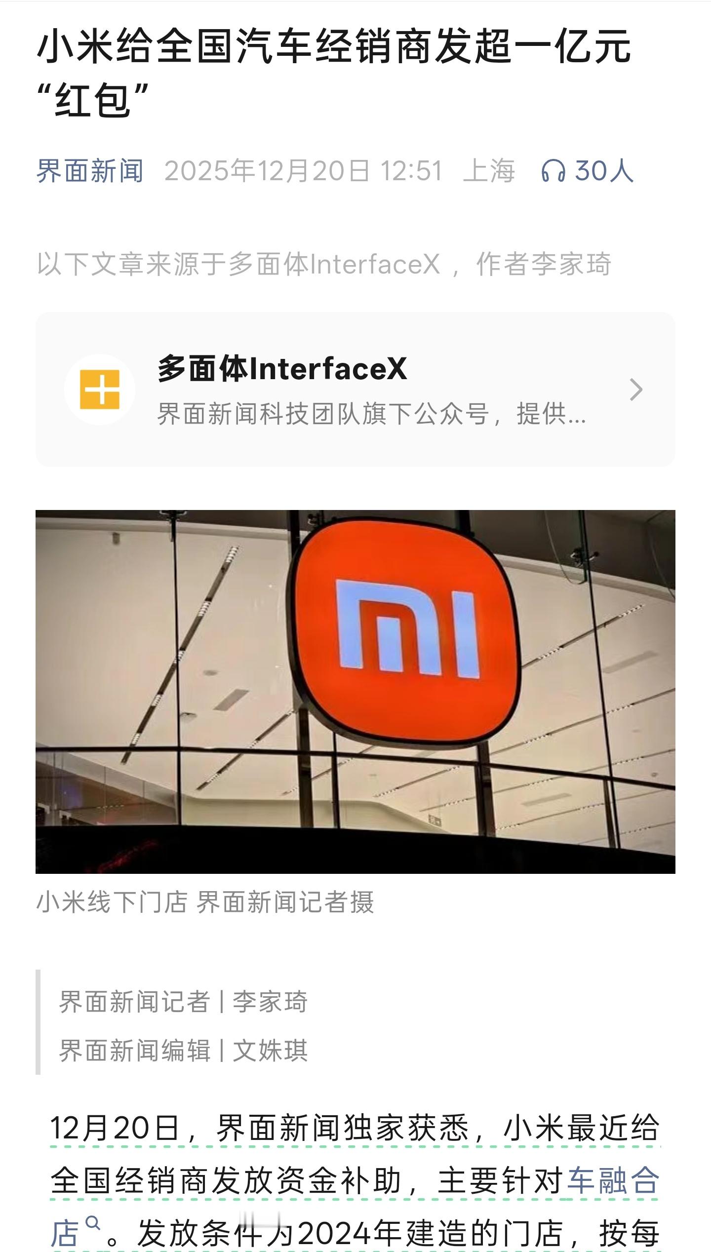 小米年底给经销商发一个多亿的大红包,具体到各家门店,10万起步。主要针对车融合店,意思很明显,感谢那些从一开始就相信小米汽车的合作伙伴,一路支持陪伴最后共享胜果。