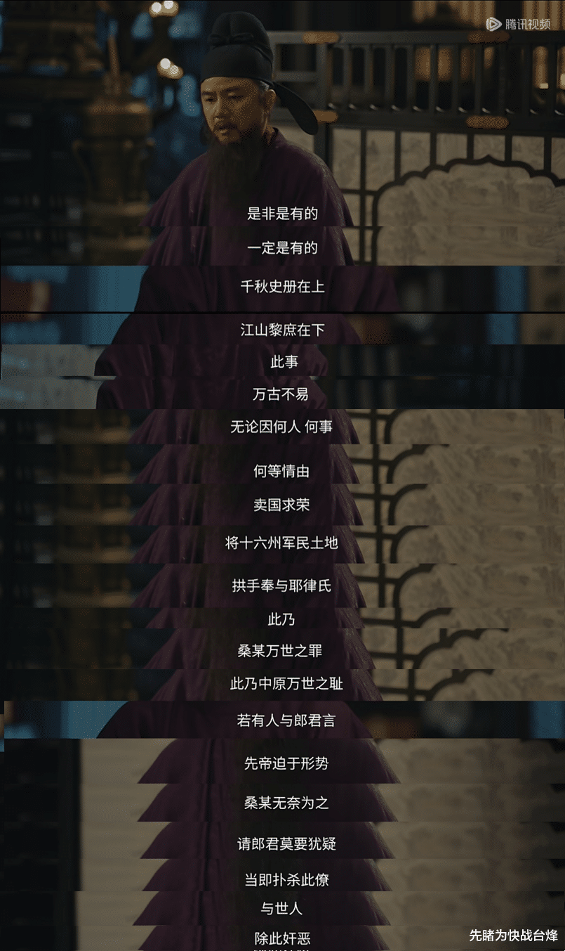 而剧中桑维翰“燕云十六州,便是桑某卖与耶律氏……此乃万世之耻。翌日,若有人与郎君言,先帝迫于形势,桑某无奈为之,请郎君莫要犹疑,当即扑杀此獠,与世人除此奸恶。”一段话,同样震耳发聩,彻底堵死了后世一切对卖国行为的狡辩之词,于古于今都有强烈的现实意义。