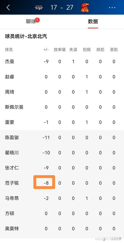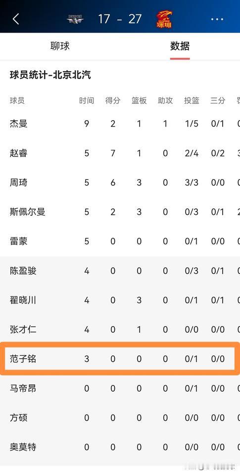 北京北汽中锋范子铭真是太软弱了!在今天北京北汽主场迎战深圳马可波罗的比赛中,目前双方的第一节比赛已经结束,北京北汽以17:27落后于对手。值得一提的是,在首节比赛中,范子铭替补出战3分钟,投篮1中0怒砍0分,最气人的是,身为中锋的范子铭竟然没有抢到1个篮板球,由此可见范子铭在篮下是多么的软弱。