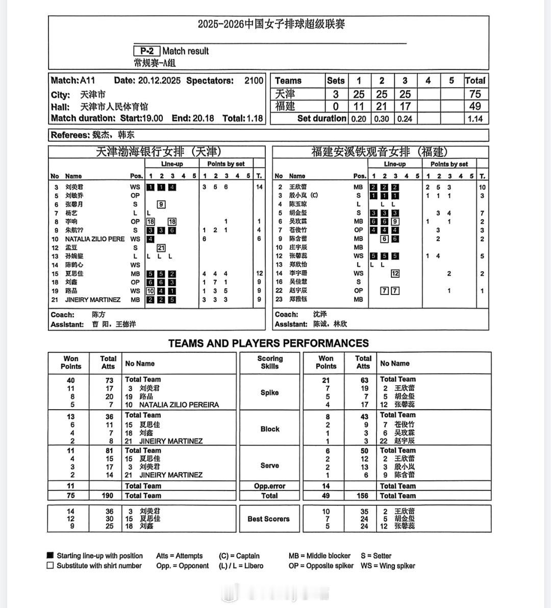 【技术统计】天津女排3比0福建女排(25-11 25-21 25-17),夏思佳3局6拦,刘鑫5拦排超联赛2025-2026中国排球超级联赛
