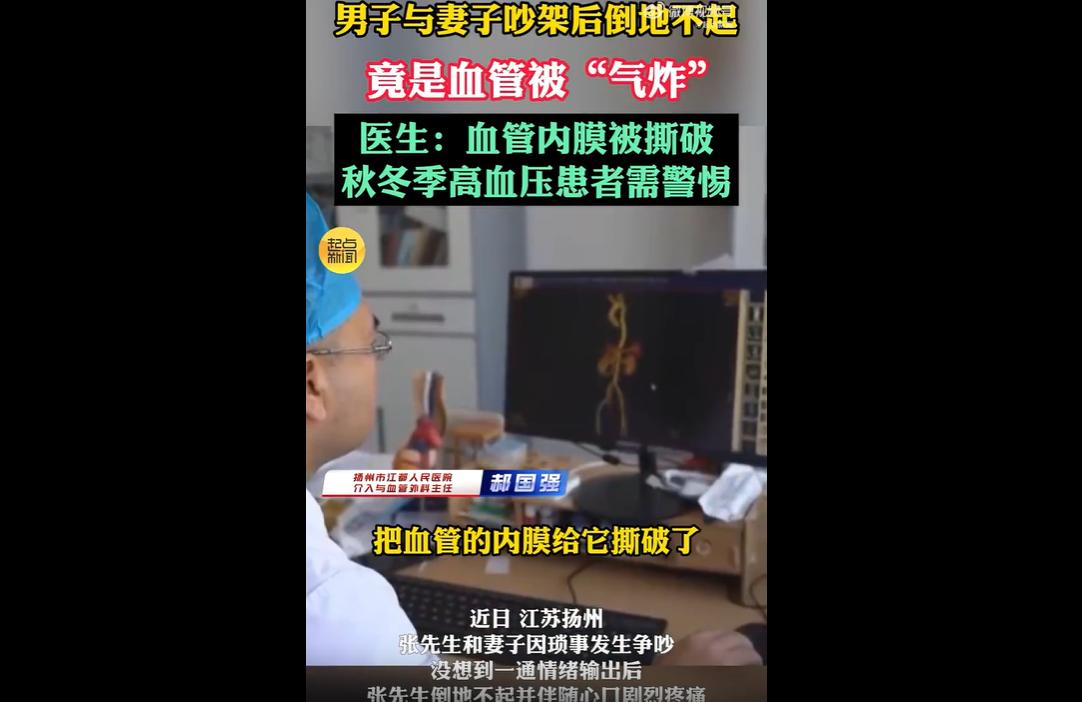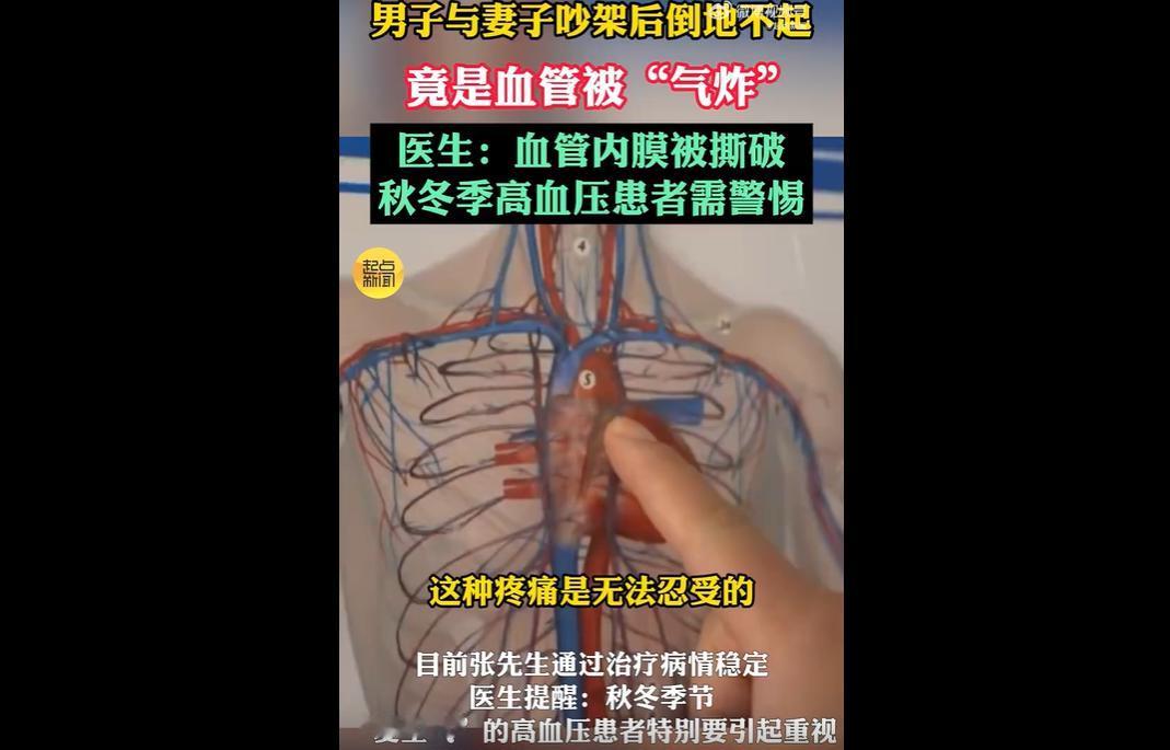近日,江苏扬州的张先生因和妻子吵架情绪激动,引发主动脉夹层内膜破裂,血管被“气炸”,送医后病情已稳定。 医生提醒,秋冬季节血管收缩,高血压患者需控制血压、保持情绪稳定,避免此类危险。 一场夫妻争吵竟把血管“气炸”,听起来离谱却真实发生,狠狠戳中了高血压人群的健康痛点。 秋冬本就是心血管疾病高发期,低温让血管收缩、血压易波动,此时情绪暴怒如同火上浇油,飙升的血压会猛烈冲击本就脆弱的血管,就像老化水管扛不住高压水流,破裂风险陡增。 很多高血压患者只盯着吃药控压,却忽视了情绪这个“隐形杀手”,总觉得“吵吵架没大碍”,殊不知一时上头的怒火,可能换来危及生命的后果。 这也给所有高血压患者敲响警钟:秋冬季节除了遵医嘱服药、监测血压,更要管好情绪,少动怒、少较真,毕竟比起争输赢,平稳的心跳和健康的身体才是最重要的。