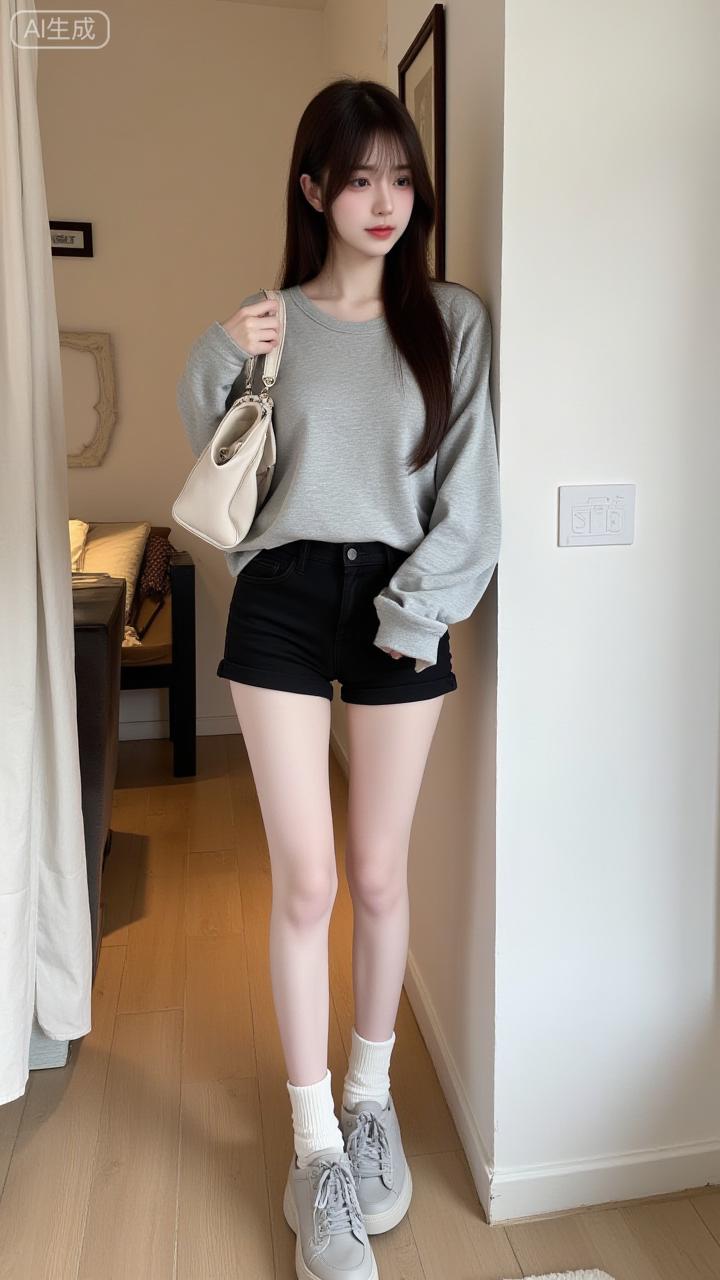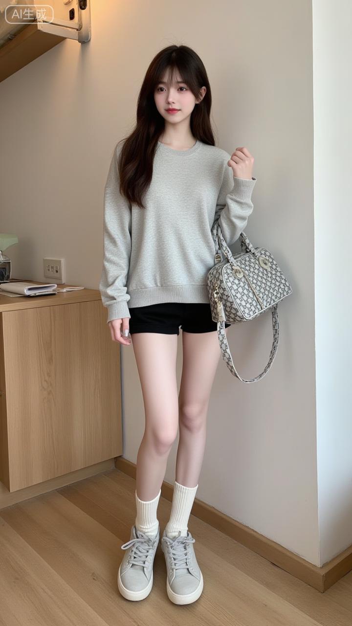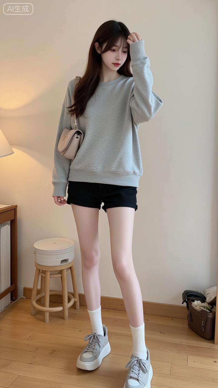 浅灰卫衣裹软光,黑短裤衬着白袜的甜,包包晃出宅家的松弛 日常休闲甜妹风浅灰穿搭