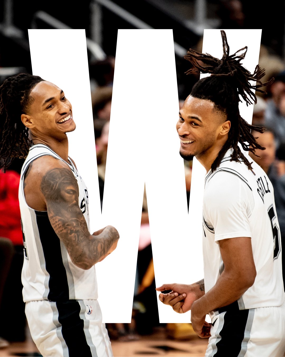 赛后,马刺官方更新X,晒出一张马刺球员德文-瓦塞尔和斯蒂芬-卡斯尔的赛场照与球迷分享。