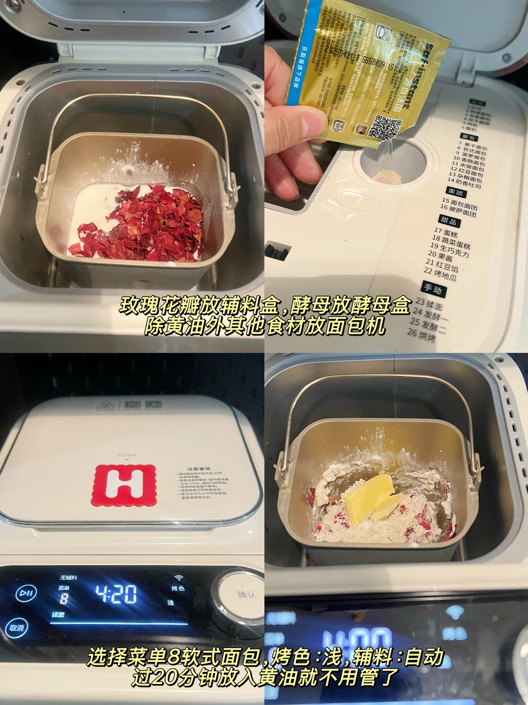 1️⃣玫瑰花瓣放辅料盒,酵母放酵母盒,除黄油外其他食材放面包机