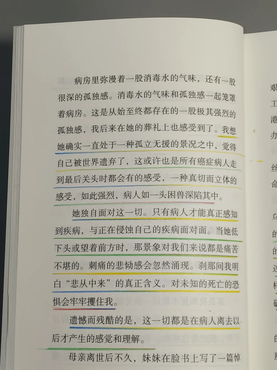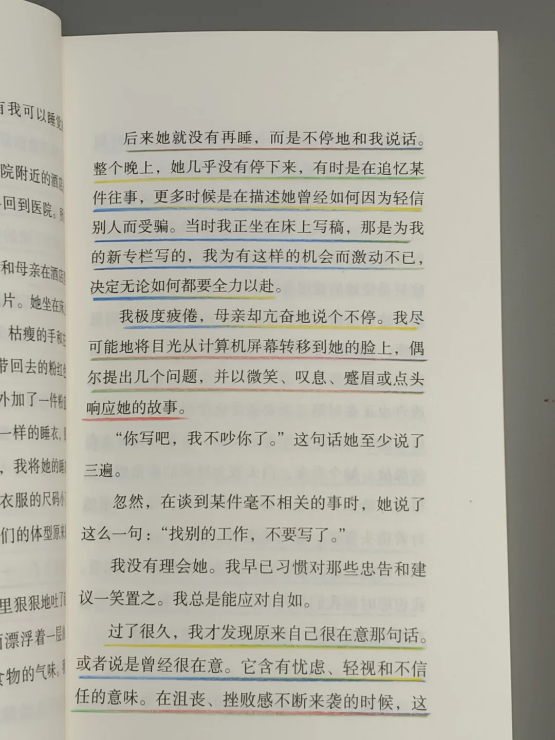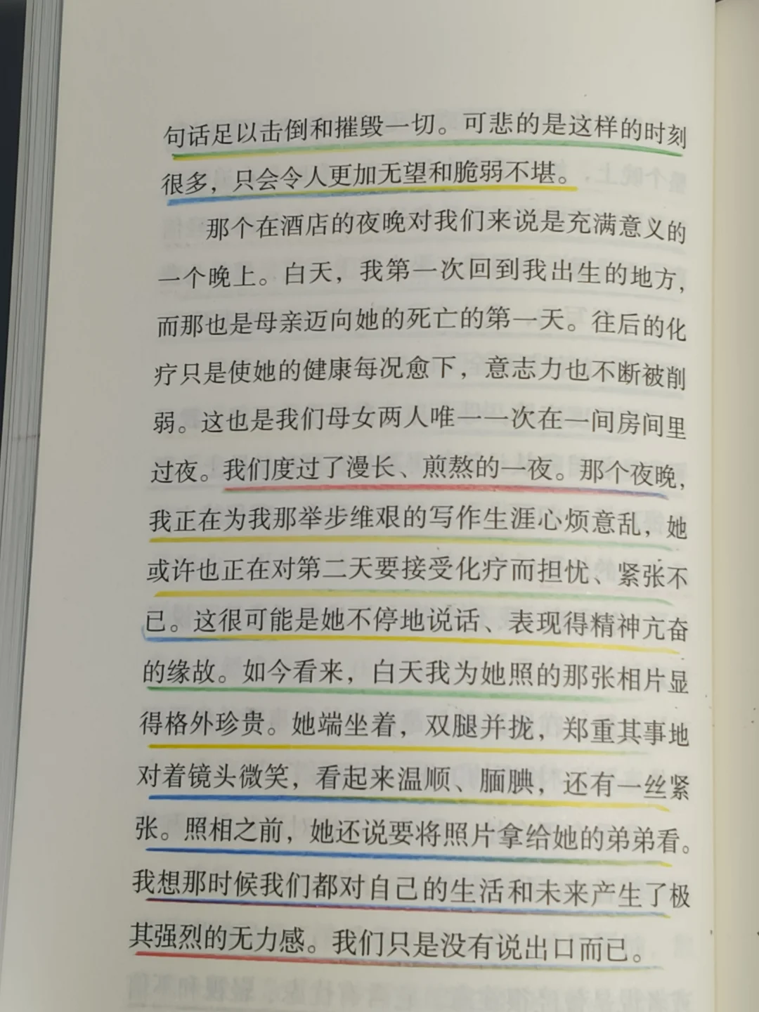 在描写母亲患病的文字,直白又沉痛。她没有刻意渲染悲伤,只是冷静地叙述着治'疗的艰难、家人的分歧、面对死亡的无力,可字里行间,那种对生命无常的恐惧、对母亲受苦的心疼,全是压抑与痛苦,如潮水般将我淹没。