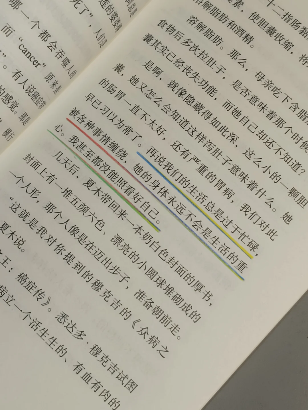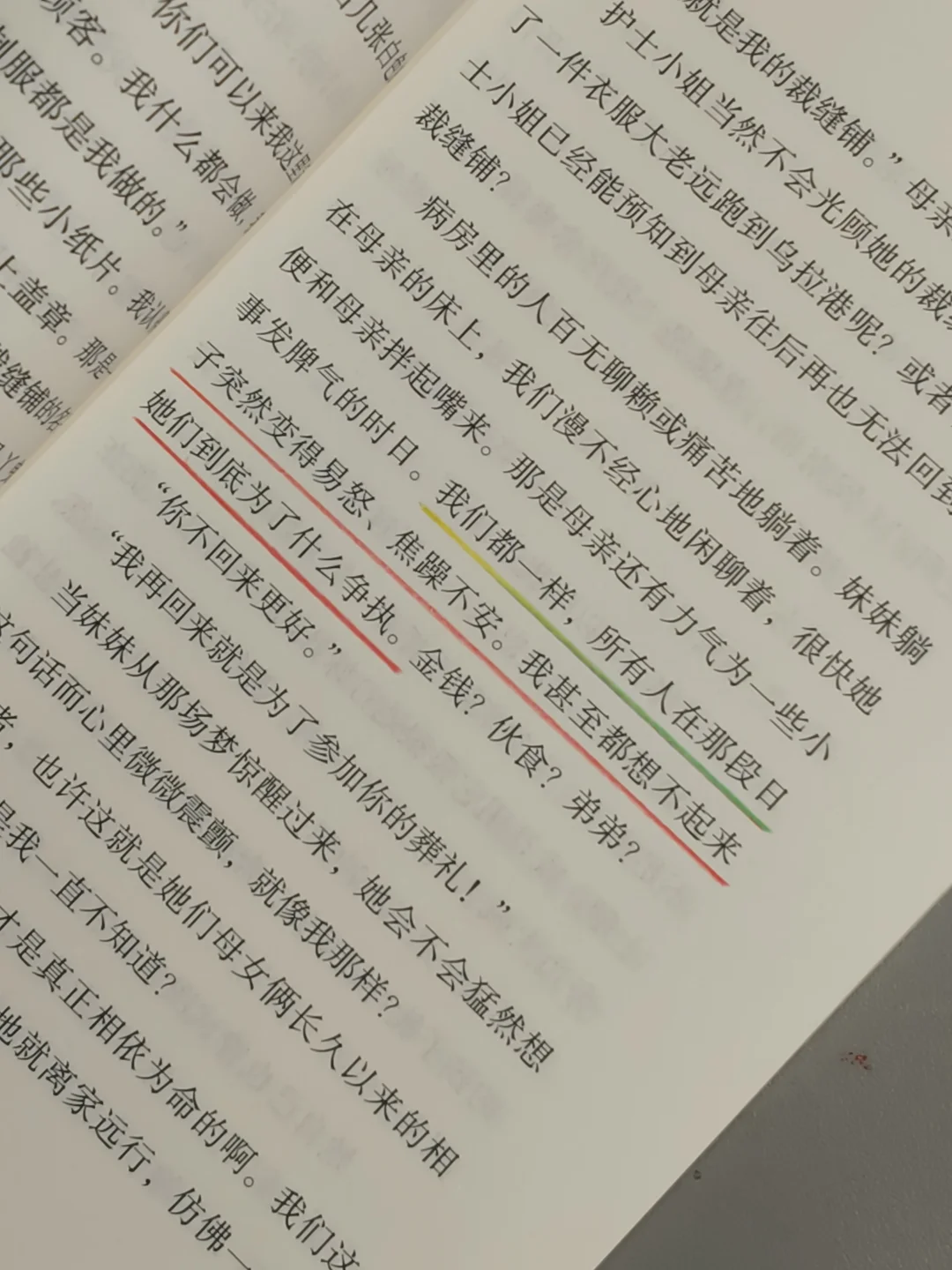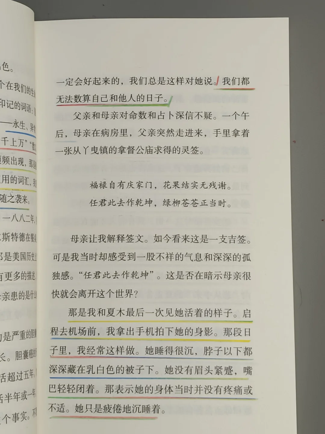 在描写母亲患病的文字,直白又沉痛。她没有刻意渲染悲伤,只是冷静地叙述着治'疗的艰难、家人的分歧、面对死亡的无力,可字里行间,那种对生命无常的恐惧、对母亲受苦的心疼,全是压抑与痛苦,如潮水般将我淹没。