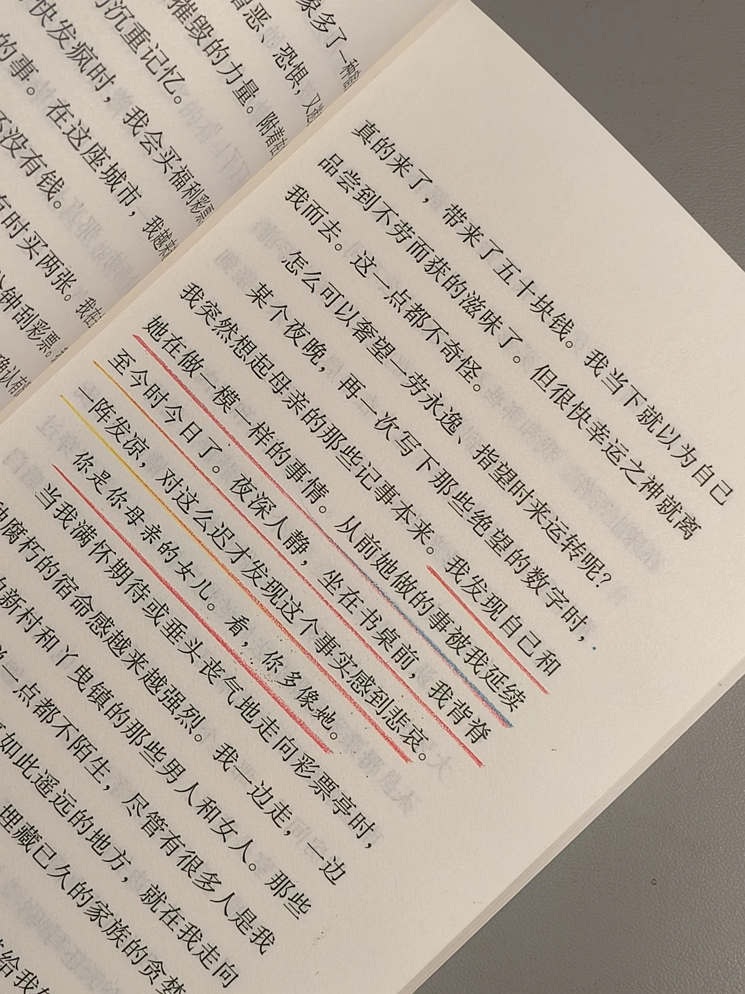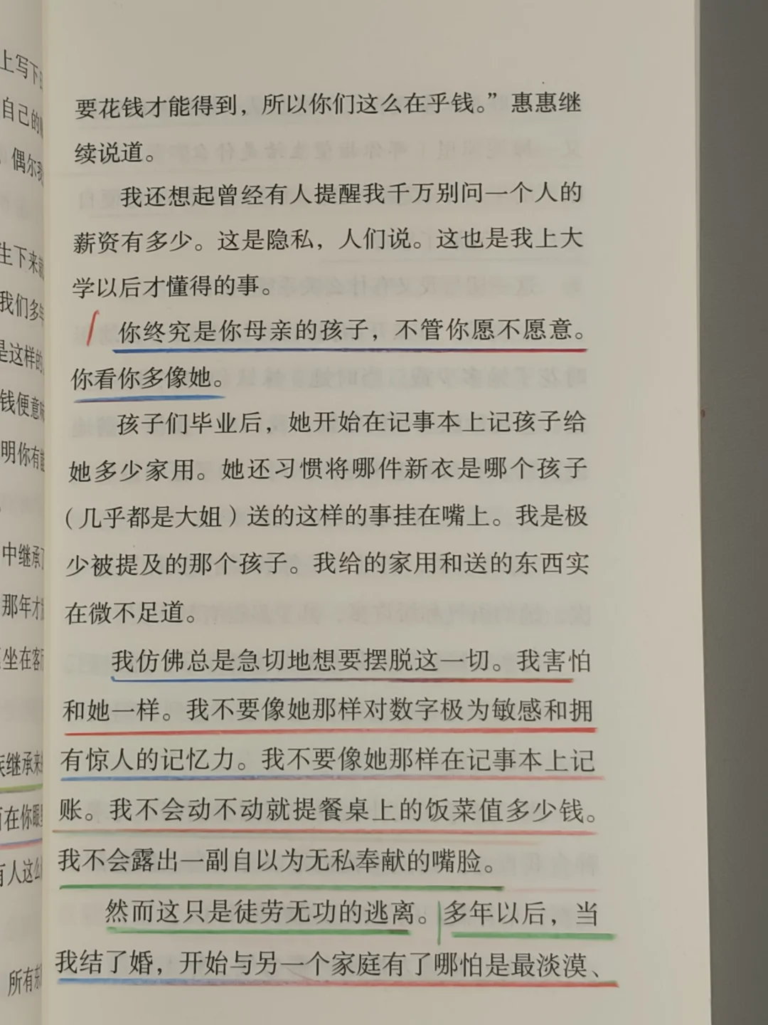 蕞触及我的是,她毫不避讳地袒露自己对母亲复杂的情感。厌烦过母亲的抱怨,逃离过家庭的压抑,可在母亲离世后,才惊觉自己早已继承了母亲的性格、习惯,那些曾经想要挣脱的东西,早已成为自己生命的一部分。