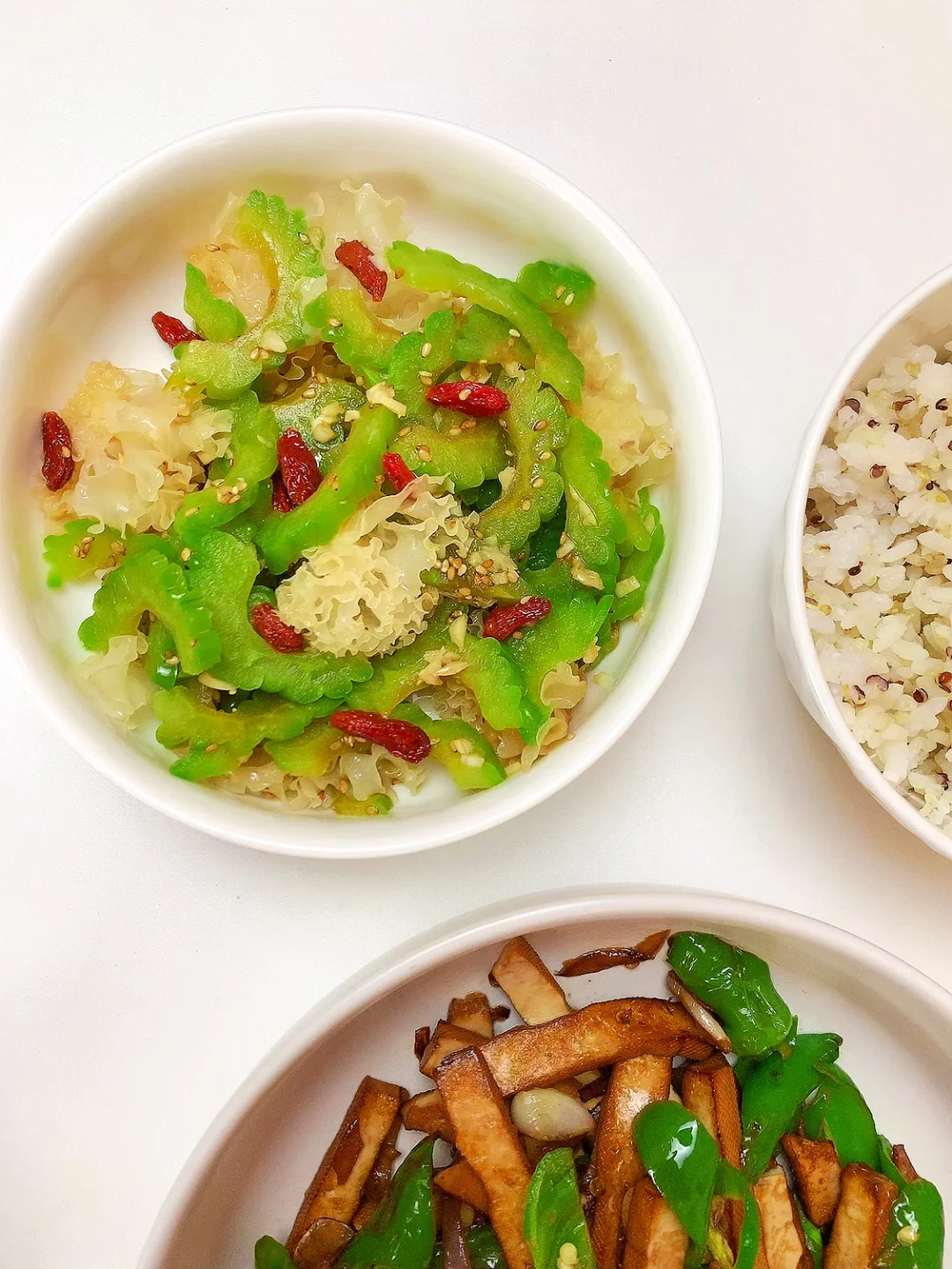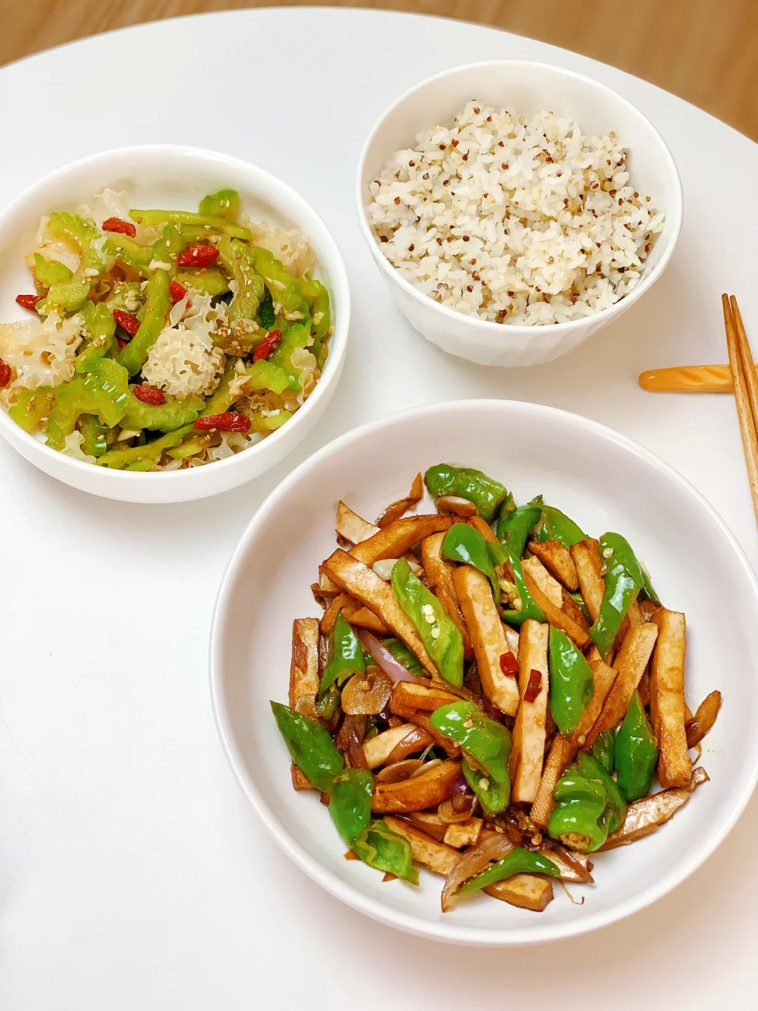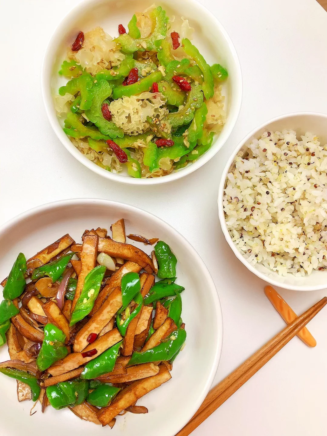👩🏻🍳分享今日菜单 [一R]香干炒青椒 [二R]苦瓜拌银耳 主食:藜麦米饭(大米:藜麦=2:1) ……………………………………………………………………………… 🛒食材清单:香干 | 青椒 | 苦瓜 | 银耳 📝早八打工人的一日三餐,拒绝外卖[偷笑R],坚持做饭的一天,哈哈哈哈,这一顿花费不到5元💰,吃简简单单干净的饭菜~ ₍˄·͈༝·͈˄*₎◞ ̑̑