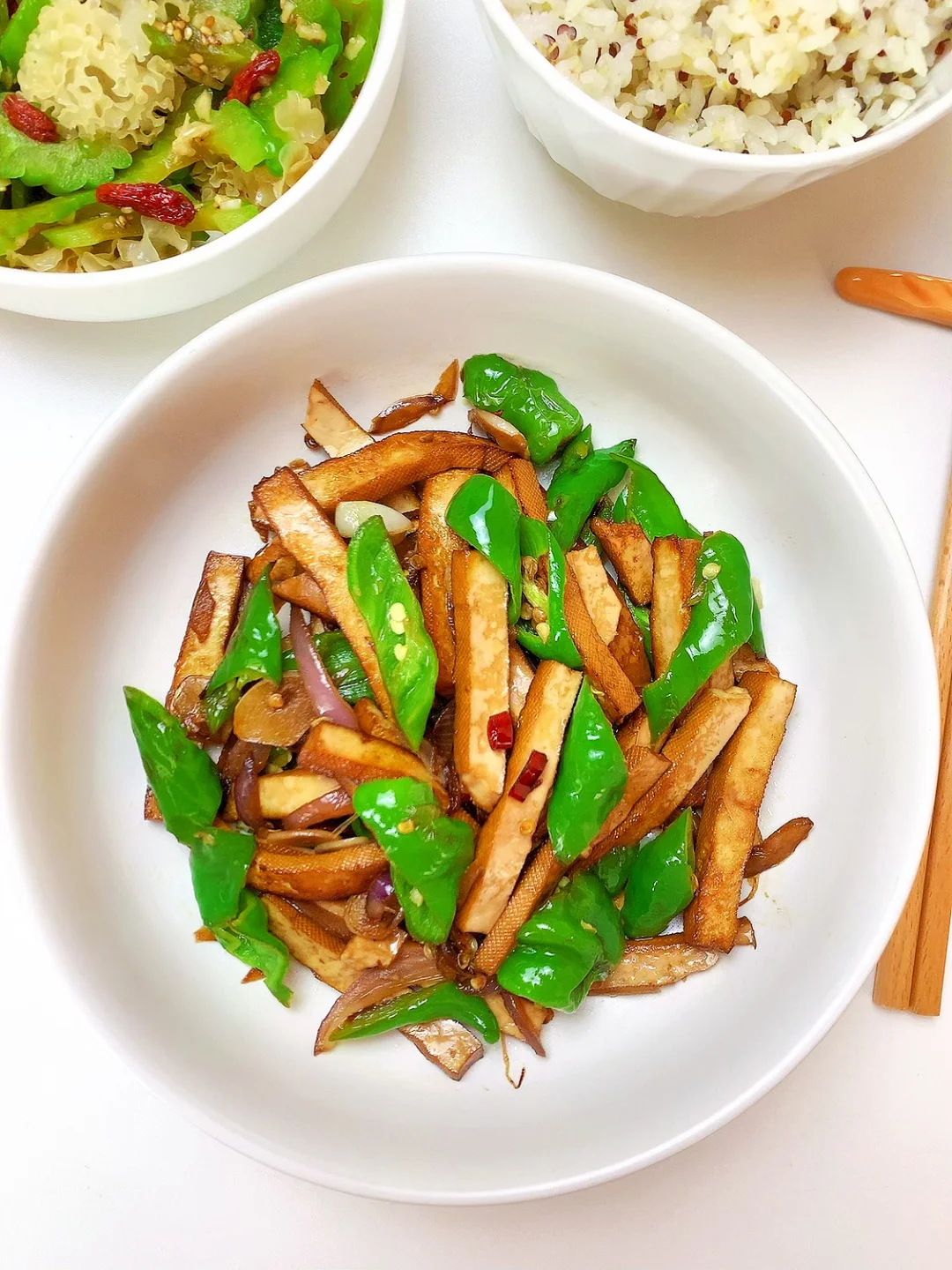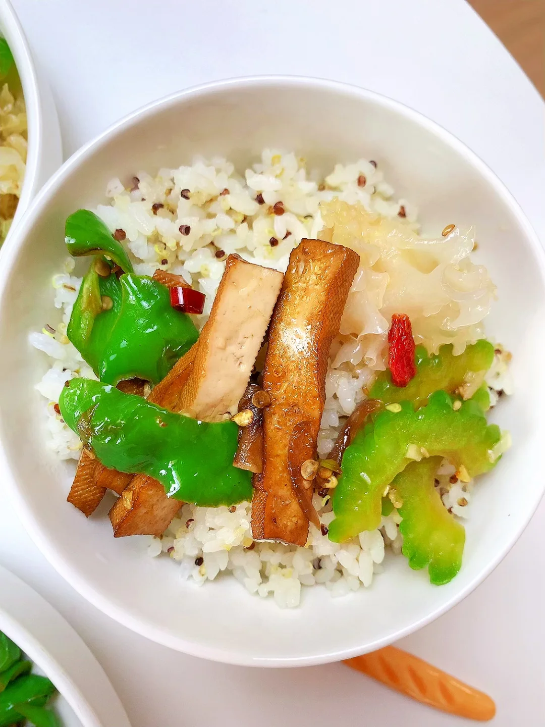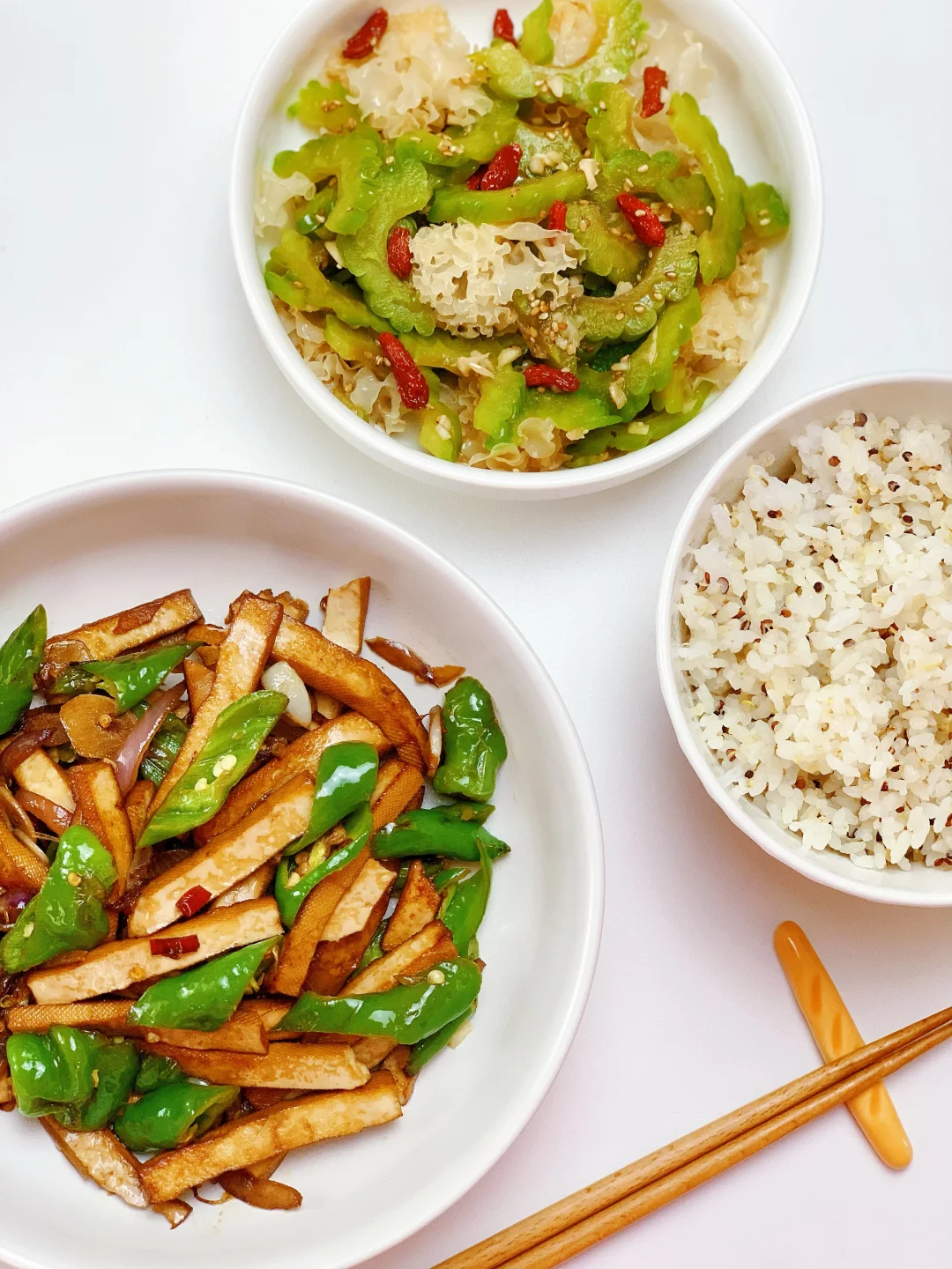 👩🏻🍳分享今日菜单 [一R]香干炒青椒 [二R]苦瓜拌银耳 主食:藜麦米饭(大米:藜麦=2:1) ……………………………………………………………………………… 🛒食材清单:香干 | 青椒 | 苦瓜 | 银耳 📝早八打工人的一日三餐,拒绝外卖[偷笑R],坚持做饭的一天,哈哈哈哈,这一顿花费不到5元💰,吃简简单单干净的饭菜~ ₍˄·͈༝·͈˄*₎◞ ̑̑